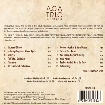 …die völkerverbindende Musik des A.G.A Trios [ist] ein mutiges Wagnis. ›Meeting‹, Begegnung heißt ihr Debütalbum mit armenischen Klageliedern, anatolischen Hirtenmelodien und georgischen Tänzen. Ein brüderliches Statement für die Multikulturalität Anatoliens und des Kaukasus.