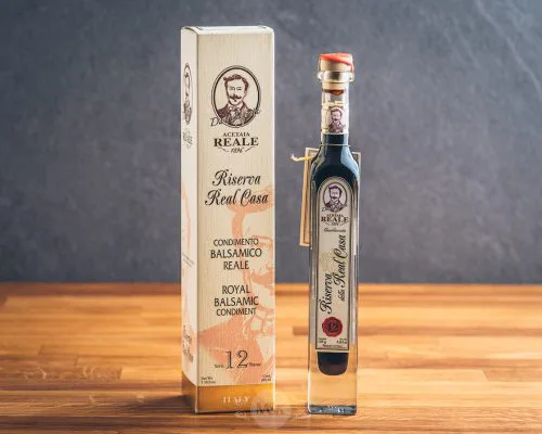 Dieser italienische Balsamicoessig hat weniger Säure als ein Aceto Balsamico. Der Riserva Real Casa „12 Travisi “ hat einen aromatischen Geschmack mit klassischen Holznoten.