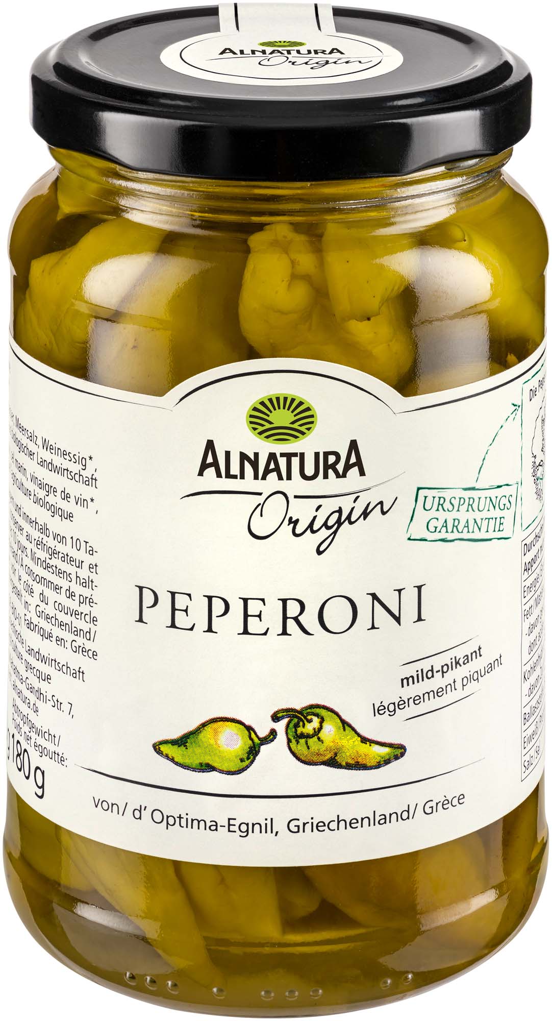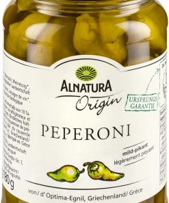 Grüne Peperoni, von Hand gepflückt und in Lake eingelegt, mit Ursprungsgarantie: Die Alnatura Origin Peperoni stammen von Optima-Egnil aus Olympia auf der griechischen Halbinsel Peloponnes in Griechenland. Mild-pikant im Geschmack sind sie ideal für jeden Vorspeisenteller und eignen sich ebenso gut als Zutat mediterraner Gerichte.
