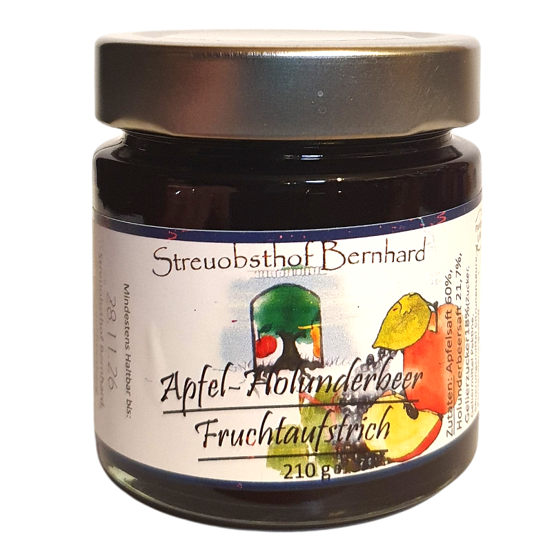 Zutaten: Apfelsaft 60%, Holunderbeersaft 21,7%, Gelierzucker18%(Zucker, Geliermittel Pektine, Säuerungsmittel Citronensäure, Konservierungsstoff Sorbinsäure)