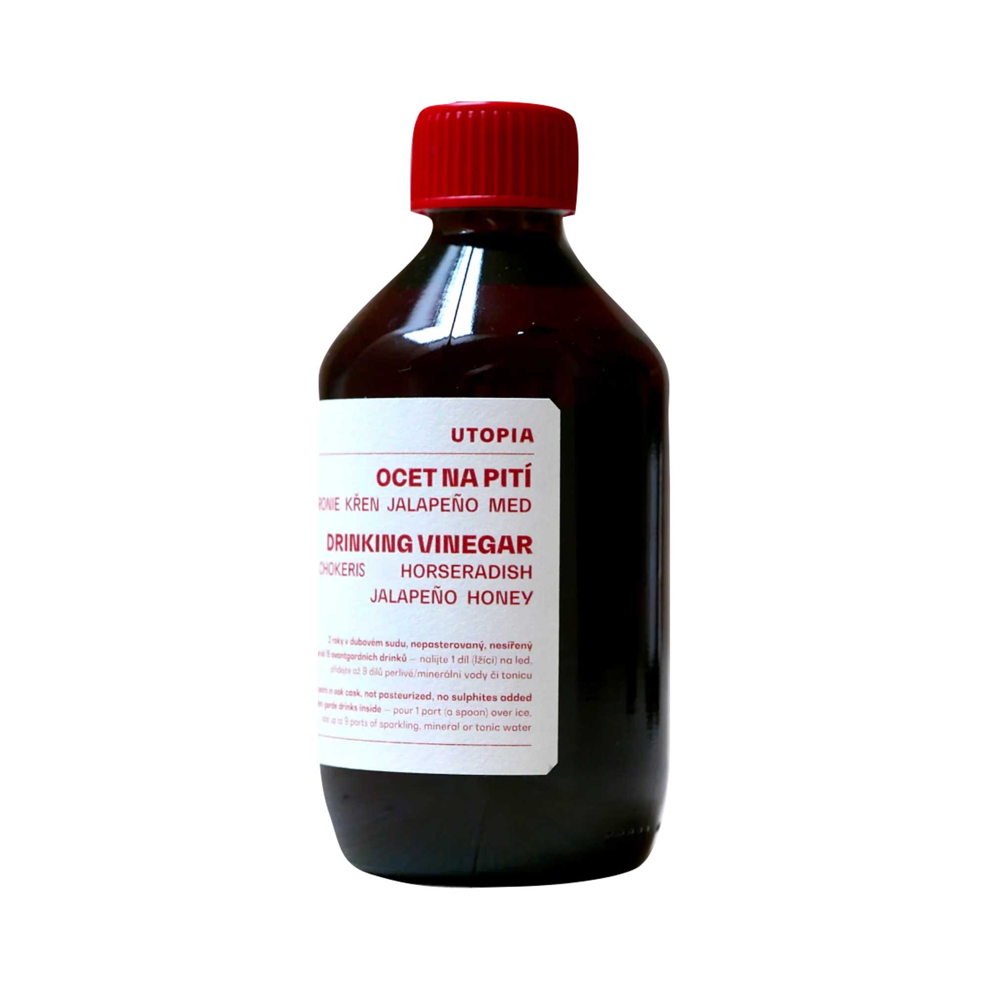 Zutaten: Apfelessig, mazeriert mit Aronia, Chilischoten und Meerrettich 80 %, Honig.