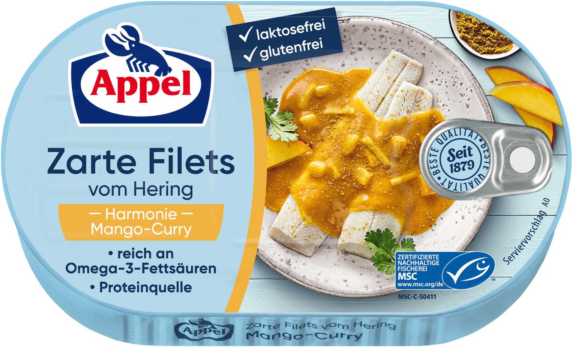 Zarte MSC Heringsfilets in einer harmonisch abgestimmten Sauce mit fruchtiger Mango und aromatischem Curry.
