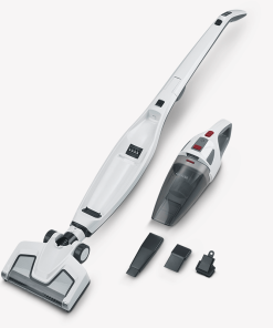 La aspiradora 2 en 1 de mano y vertical ofrece una larga autonomía de 32 minutos en modo Eco y funciona con una batería de iones de litio de 18,5 voltios. Cuenta con una aspiradora de mano extraíble para mayor versatilidad y un mango plegable para guardarla fácilmente. La boquilla con iluminación LED proporciona una iluminación óptima y ayuda a limpiar a fondo.