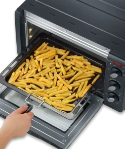 Deze bak- en tosti-oven heeft een convectiefunctie en een vermogen van ongeveer 1500 W. Met een inhoud van ca. 20 liter, een draaispit en een pizzasteen met een diameter van 29 cm kan hij op verschillende manieren worden gebruikt. De binnenverlichting zorgt voor optimaal zicht tijdens het koken.