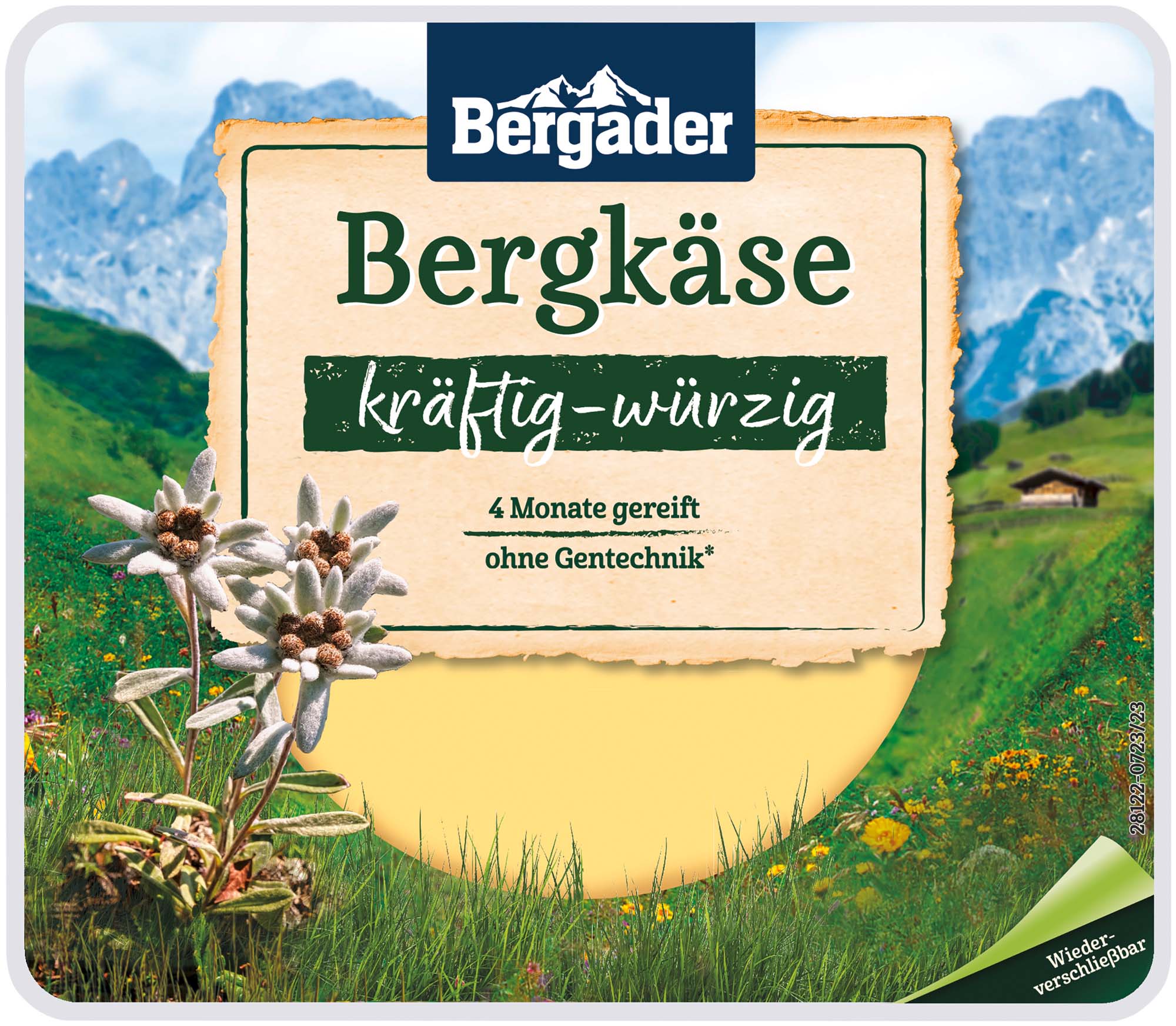 Bergader Bergkäse verwöhnt Hartkäsefans mit kräftig-würzigem und pikantem Geschmack. Tagesfrische Alpenmilch, handwerkliches Können und 4 Monate behutsame Reifung garantieren seine unverwechselbare Geschmacksfülle und feine Konsistenz. In Scheiben geschnitten entfaltet er sein spezielles Aroma. Die charakteristische Rinde ist zum Verzehr geeignet.