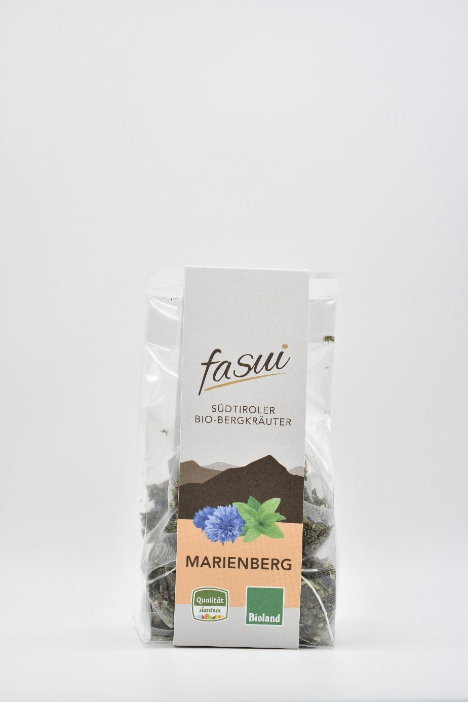 Der Bio Kräuteraufguss Marienberg ist eine erlesene Mischung aus zehn ausgewählten Alpenkräutern, darunter Pfefferminze, Zitronenmelisse, Zitronenverbene, Frauenmantel, Malve, Ringelblume, Kornblume, Holunderblüte, Salbei und Schafgarbe. Die Kräuter stammen aus biologischem Anbau in Südtirol und werden schonend verarbeitet. Der Aufguss überzeugt mit frischen, blumigen und leicht würzigen Noten und eignet sich ideal für entspannte Genussmomente und den täglichen Ausgleich.