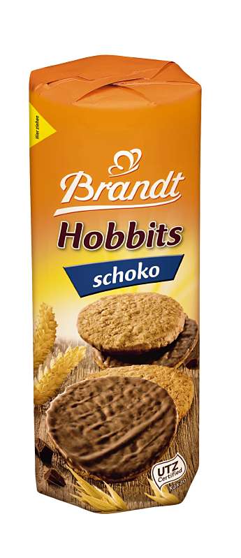 Knackig und kernig mit vollwertigem Getreide und Haferflocken sowie einer Schokoladenseite aus leckerer Vollmilchschokolade – das sind Brandt Hobbits schoko.