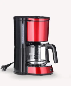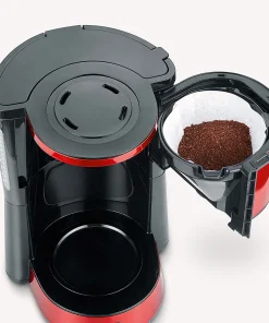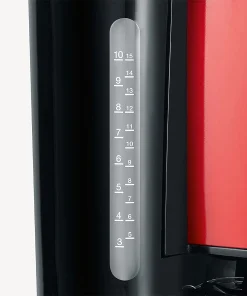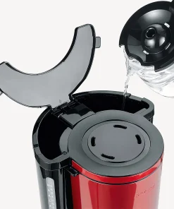 Machine à café haut de gamme au design moderne en acier inoxydable laqué de couleur rouge métallique, avec une capacité allant jusqu’à 10 tasses (1,25 litre). L’appareil a une taille de filtre de 1 x 4 et s’arrête automatiquement après un certain temps sans utilisation. Les dimensions de l’appareil, 29 x 23 x 34 cm, permettent à la machine à café de s’intégrer dans presque toutes les cuisines. Un compartiment intégré pour le rangement du câble permet un stockage pratique de l’appareil. Grâce à l’indicateur de niveau d’eau bien visible, vous avez toujours le contrôle.