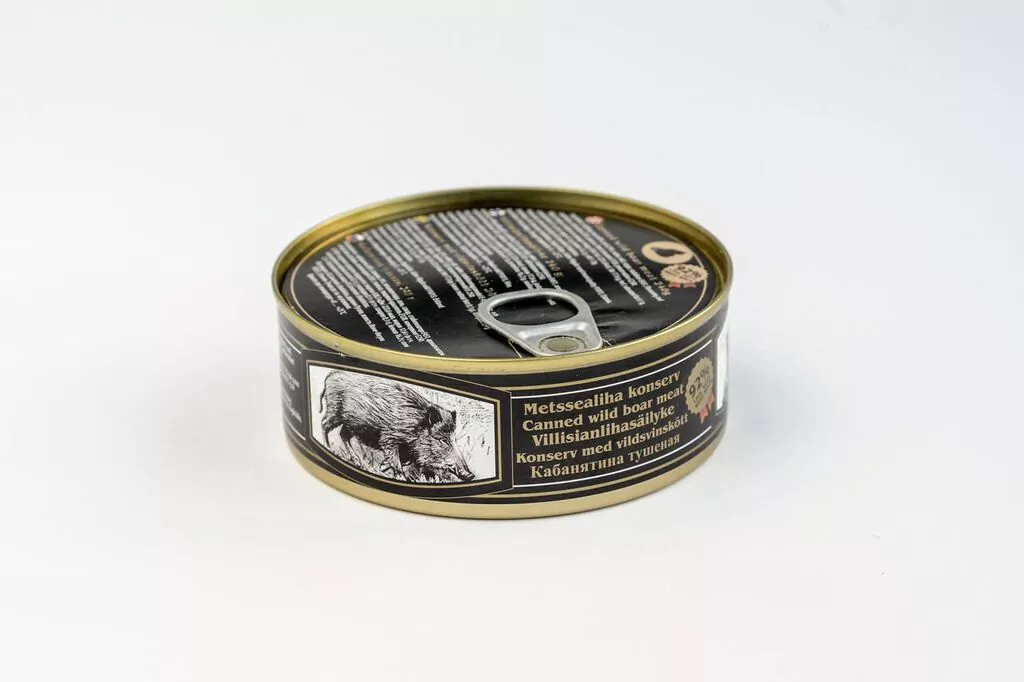Wildschweinfleisch aus der Dose von Jagdzügen in den Wäldern Nordeuropas.