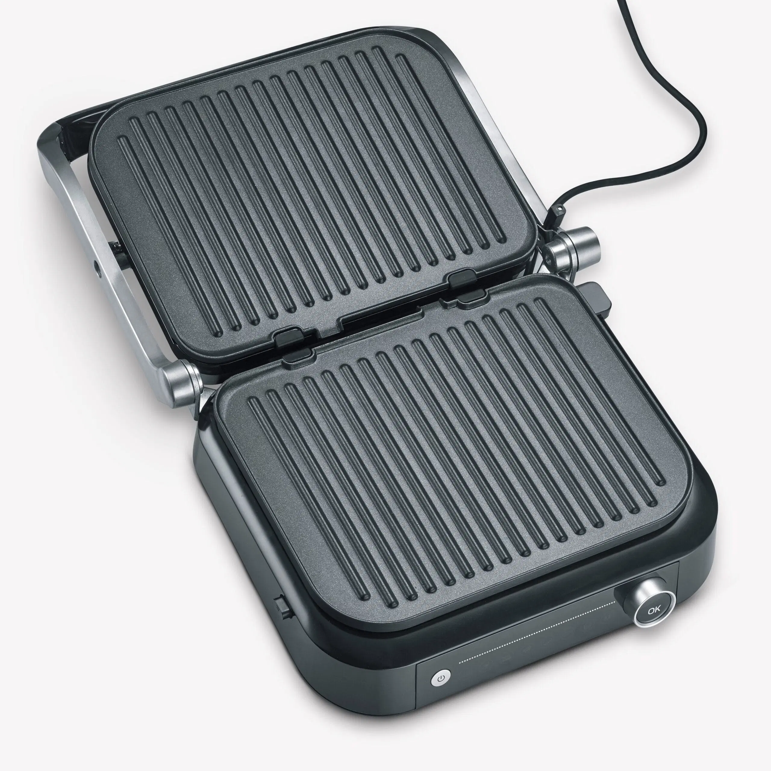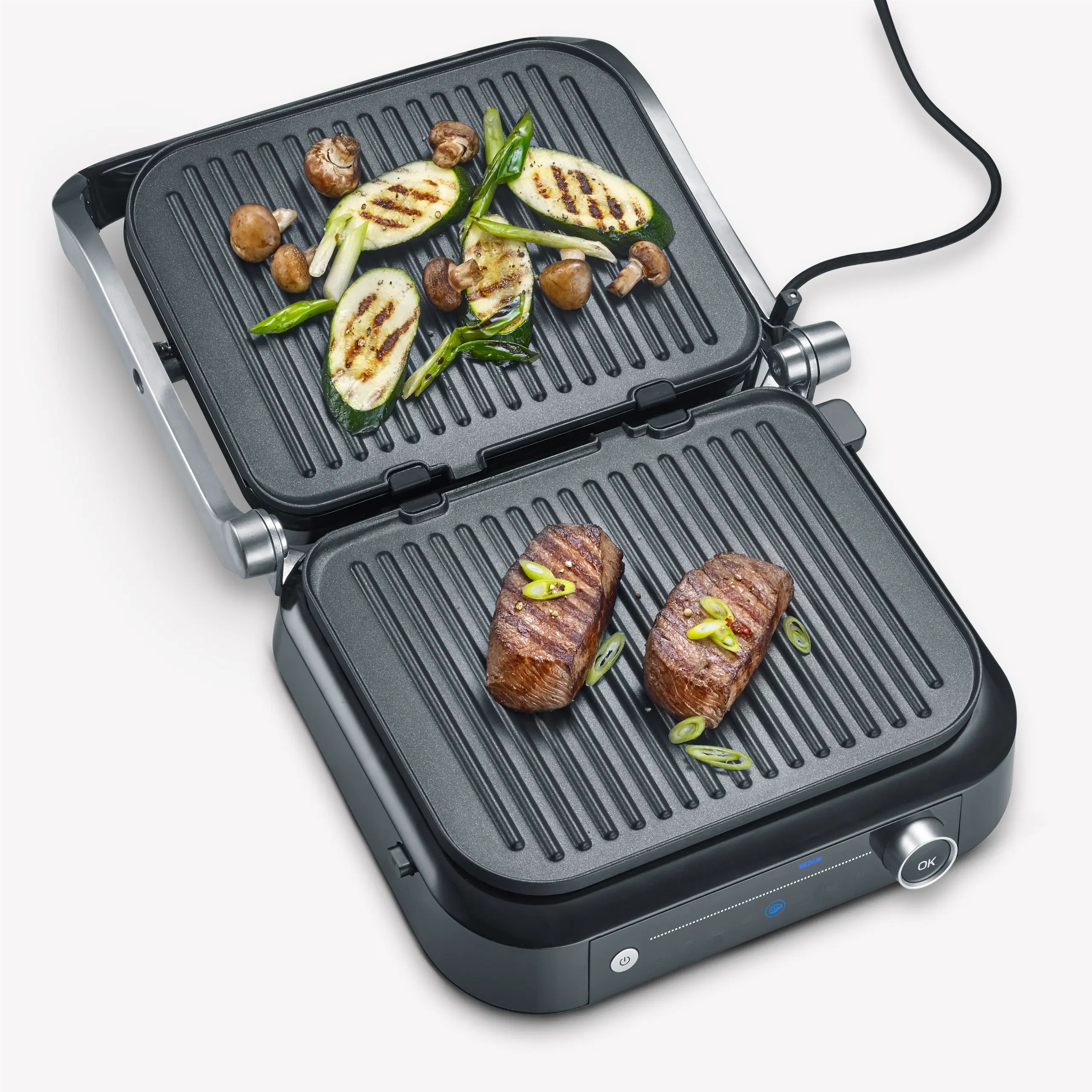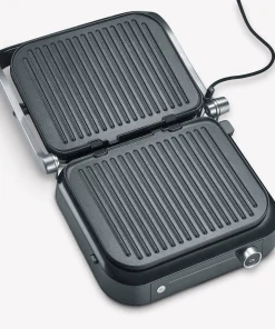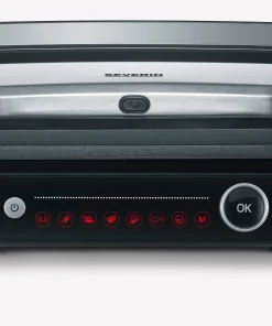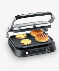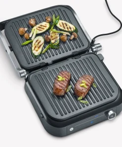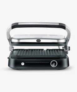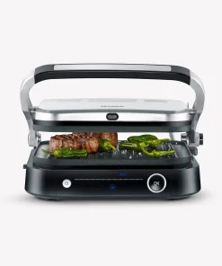 This grill offers versatile grilling options with 7 different automatic programs and a manual grilling program, so that every taste can be satisfied. The “Perfect Steak” program includes a sensor that detects the thickness of the food and indicates when different cooking levels have been reached. This grill can be used both as a contact and table grill, thanks to its hinged grilling surface. A practical on/off switch ensures easy operation, and the appliance has a grease drip tray at the back for easy cleaning.