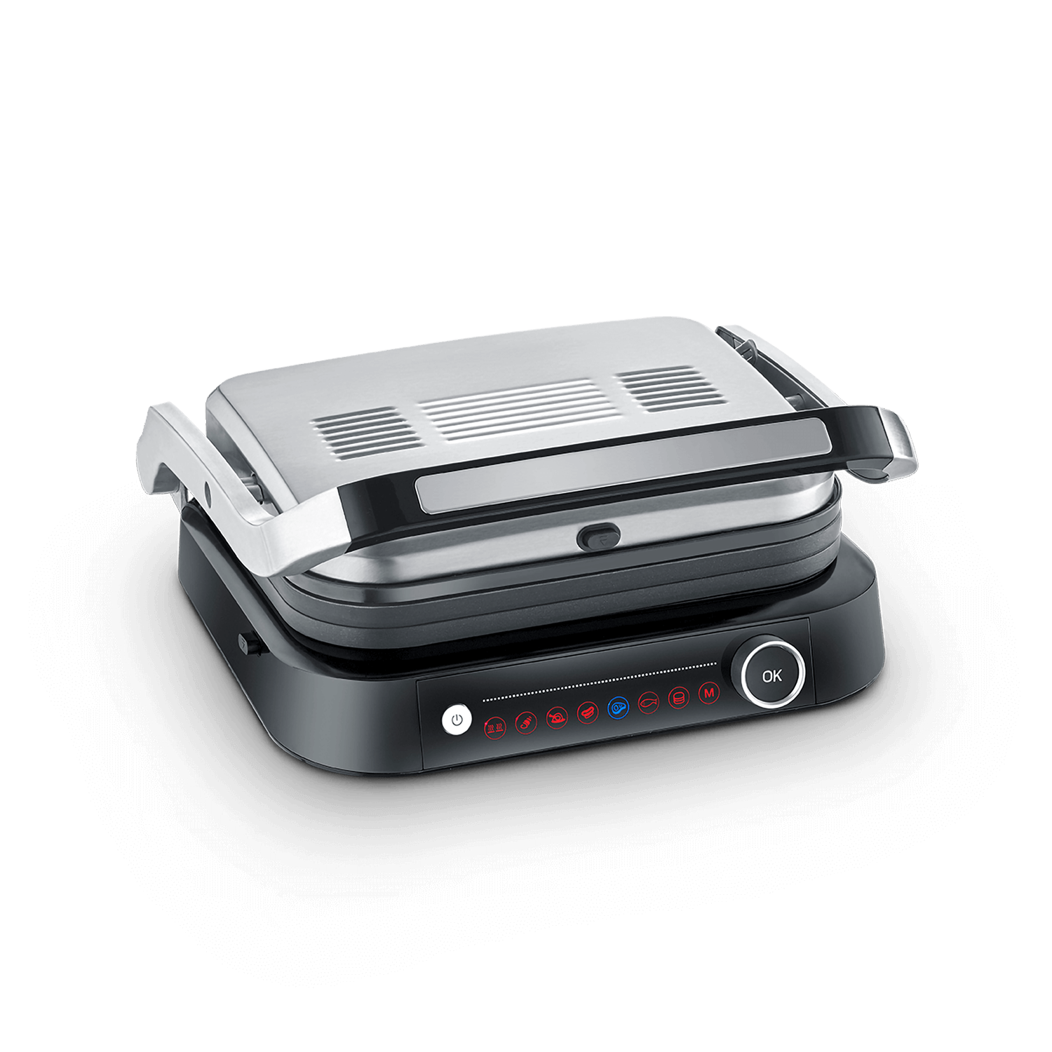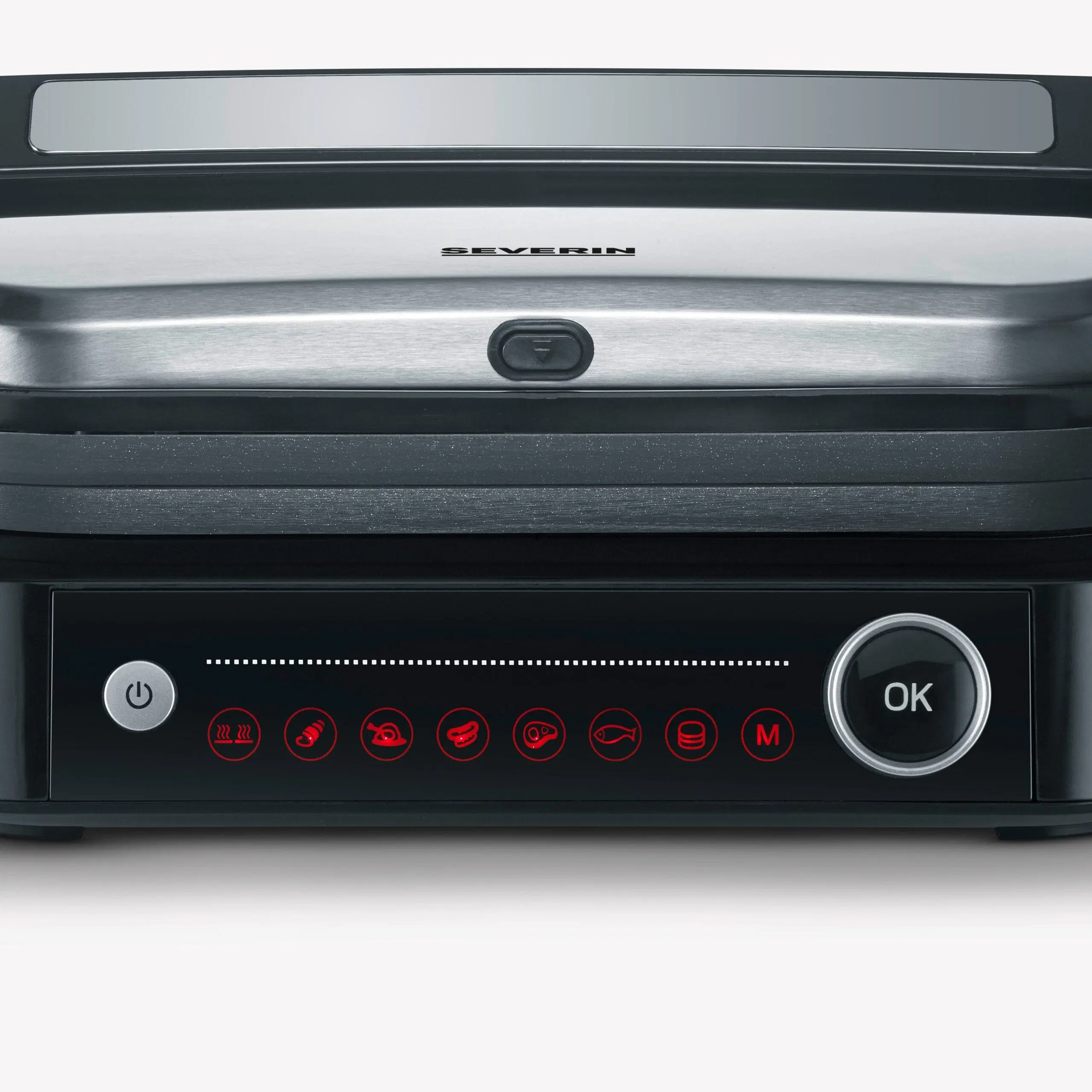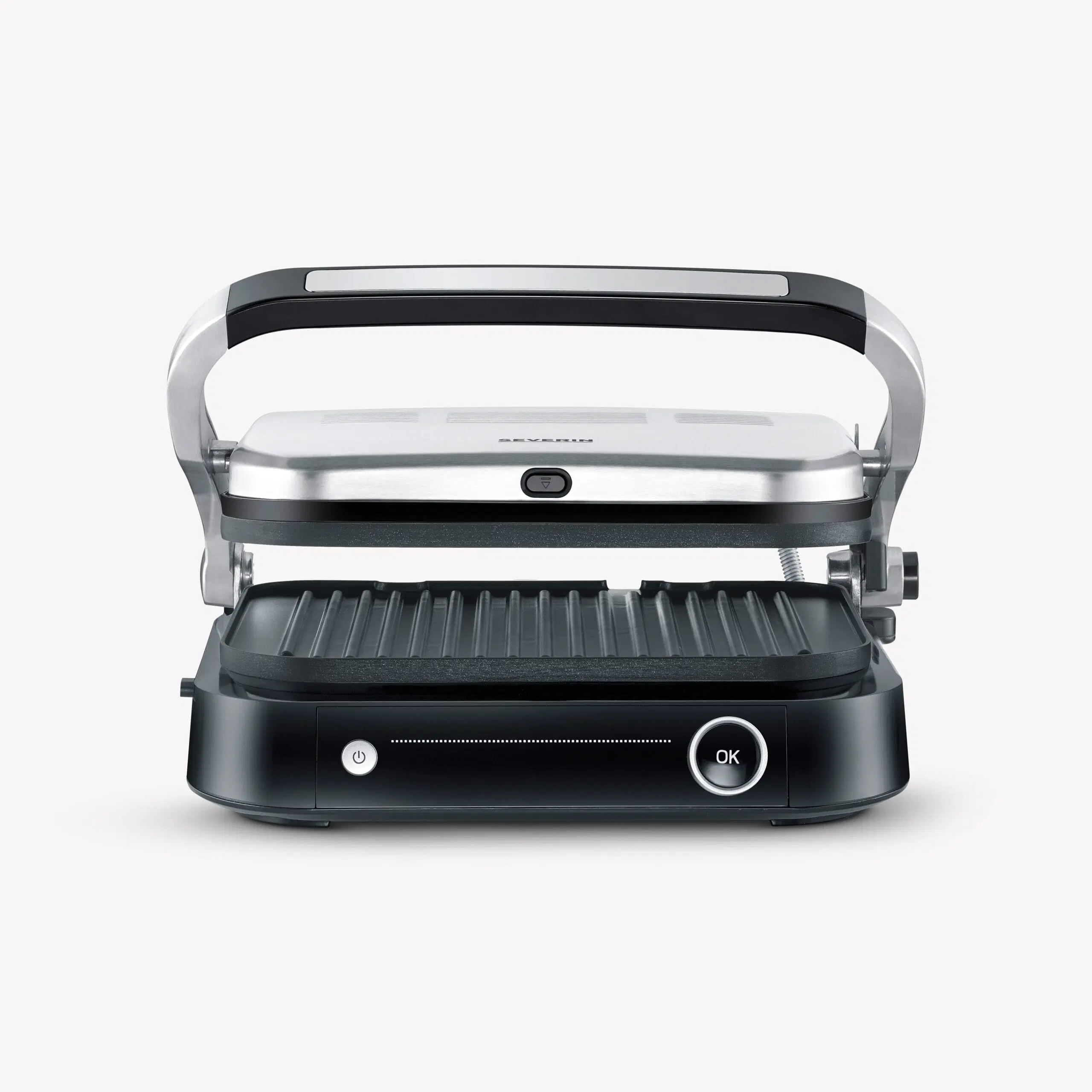 This grill offers versatile grilling options with 7 different automatic programs and a manual grilling program, so that every taste can be satisfied. The “Perfect Steak” program includes a sensor that detects the thickness of the food and indicates when different cooking levels have been reached. This grill can be used both as a contact and table grill, thanks to its hinged grilling surface. A practical on/off switch ensures easy operation, and the appliance has a grease drip tray at the back for easy cleaning.