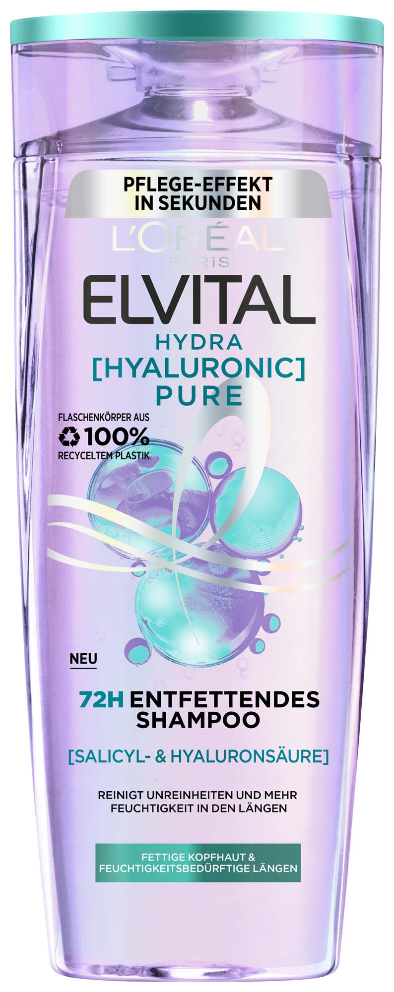 Fettige Kopfhaut und feuchtigkeitsbedürftige Längen? Unser reinigendes Shampoo sorgt für langanhaltende Frische am Haaransatz, spendet Feuchtigkeit für bis zu 72 Stunden* in den Längen und befreit die Kopfhaut von überschüssigem Fett, ohne auszutrocknen und ohne zu beschweren. Die Kraft von Salicyl- und Hyaluronsäure: Mit der reinigenden Formel befreit die Salicylsäure die Kopfhaut von überschüssigem Fett, während Hyaluronsäure für mehr Feuchtigkeit sorgt und das 1000-Fache ihres Gewichts an Wasser bindet. Kombiniert ist es die perfekte Anwendung, um die Kopfhaut intensiv zu reinigen und die Längen mit Feuchtigkeit zu versorgen.