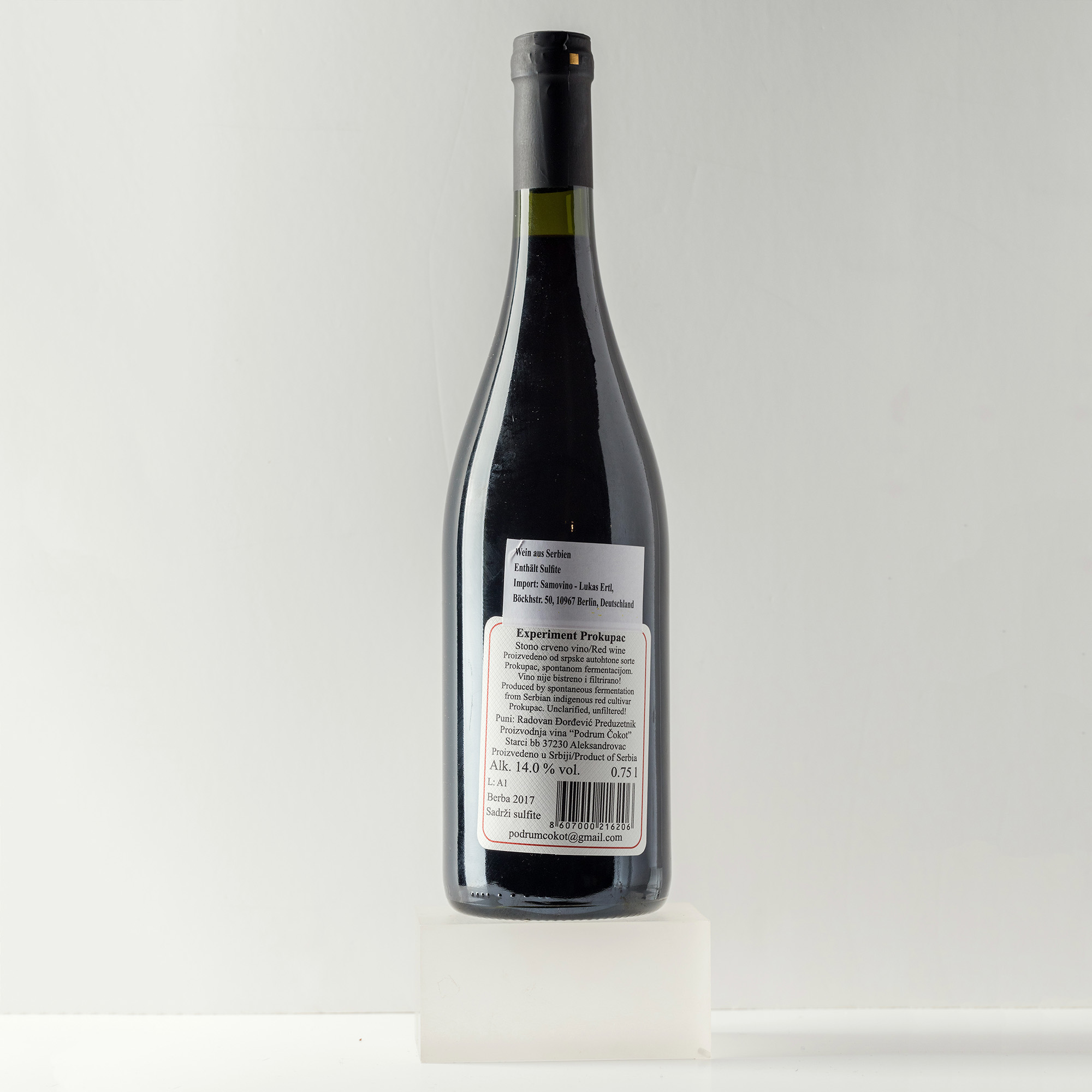 Čokot besitzt 1,5 Hektar und kauft weitere 1,5 Hektar von umliegenden Bauern zu. Das reicht für 8.000 Liter Wein. Kein großes Geschäft bisher, aber mit jeder Ernte investiert Radovan in neues Equipment. Zwei Sorten werden hier angebaut, Prokupac und Tamjanika. Beides autochtone serbische Sorten. Alle Weine, Prokupac, Rosé und Tamjanika wurden mit dem Namen Experiment versehen. Das entspricht Radovan’s Philosophie, jeder Wein ist anders, jeder Tag in der Produktion bietet neue Herausforderungen und die immer neuen Lösungen sind so einzigartig wie die Weine selbst.