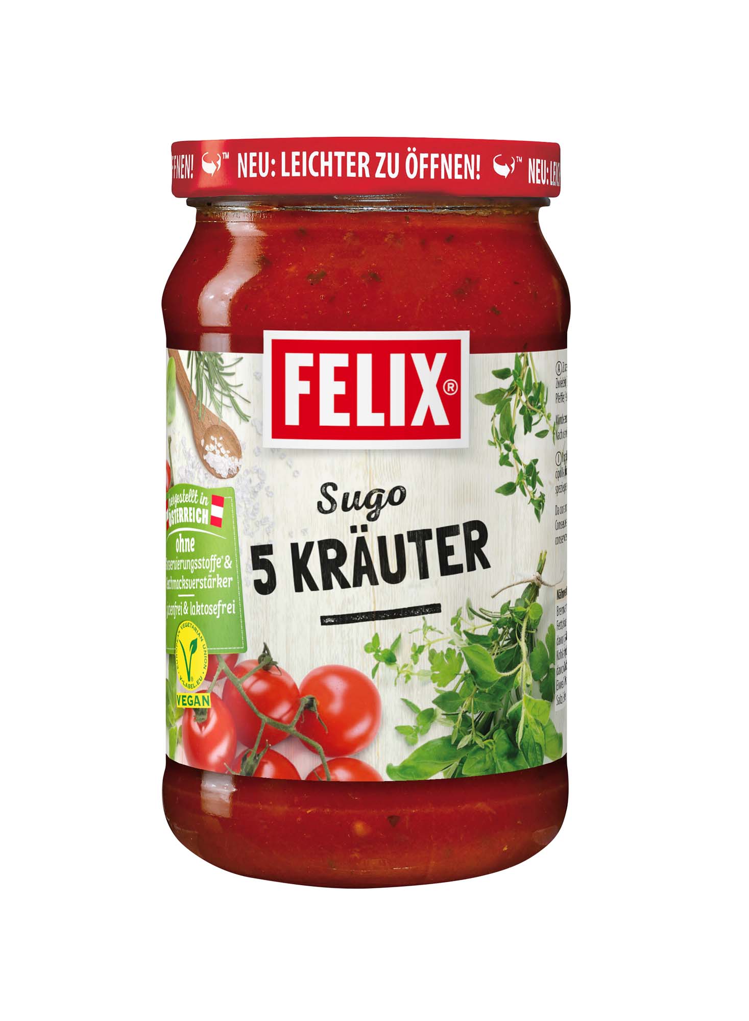 FELIX Sugo 5 Kräuter ist ein Multitalent in der Küche und begeistert mit feinem Basilikum, geschmackvoller Petersilie, herzhaftem Oregano, würzigem Thymian und aromatischem Rosmarin in einer fruchtigen Tomatensauce.