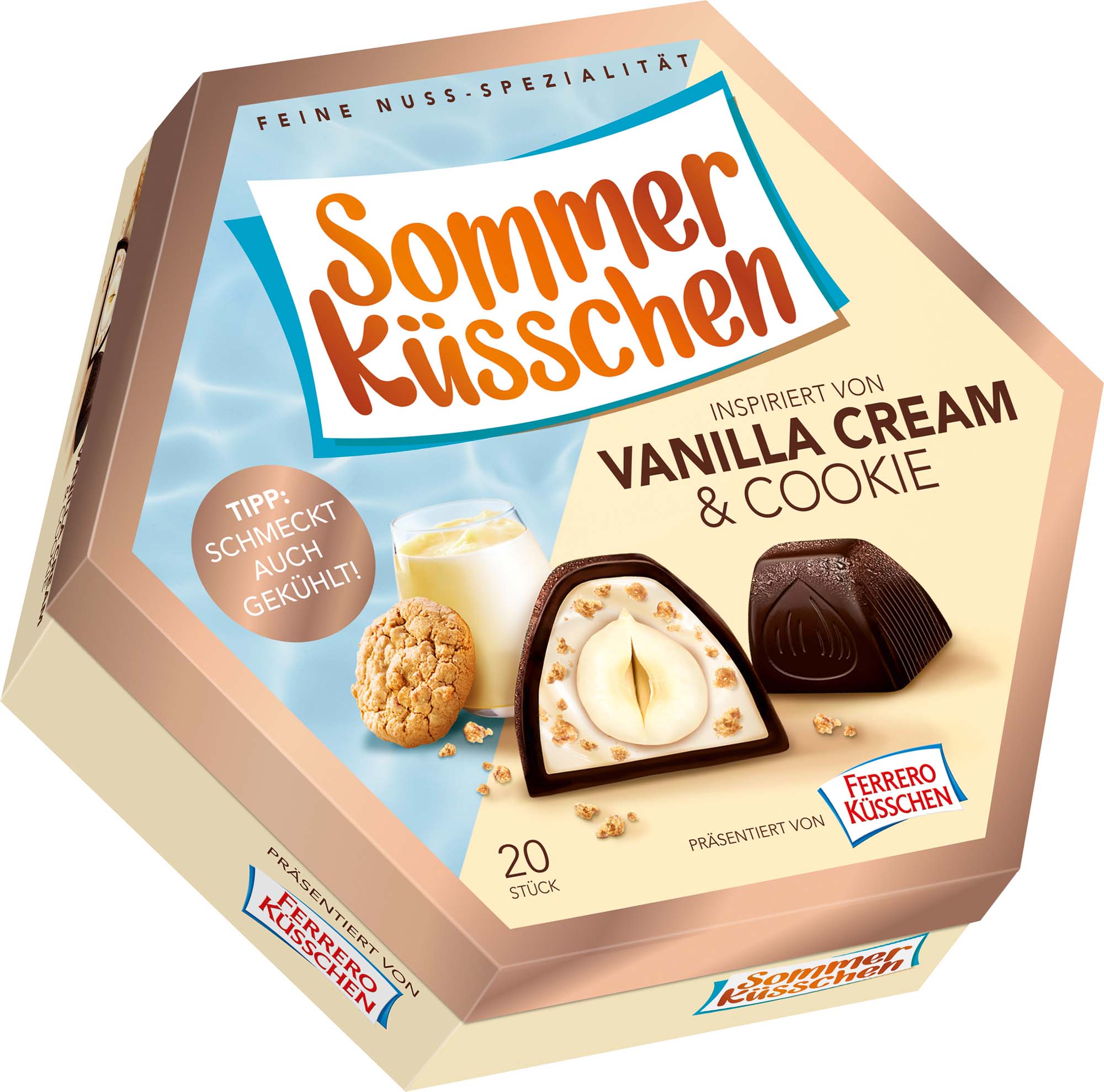 Ein knackiger Haselnusskern eingebettet in eine Creme mit Vanille-Geschmack und Cookie Stückchen umhüllt von leckerer Halbbitter-Schokolade – das ist das neue Sommer Küsschen Vanilla Cream&Cookie präsentiert von Ferrero Küsschen!
