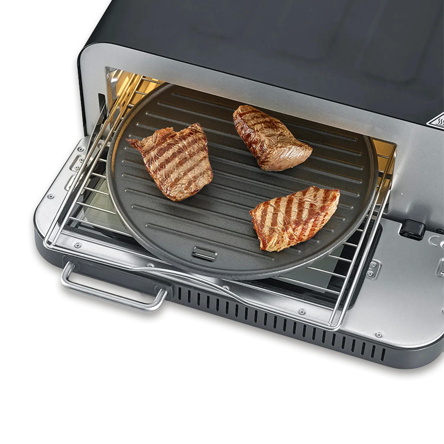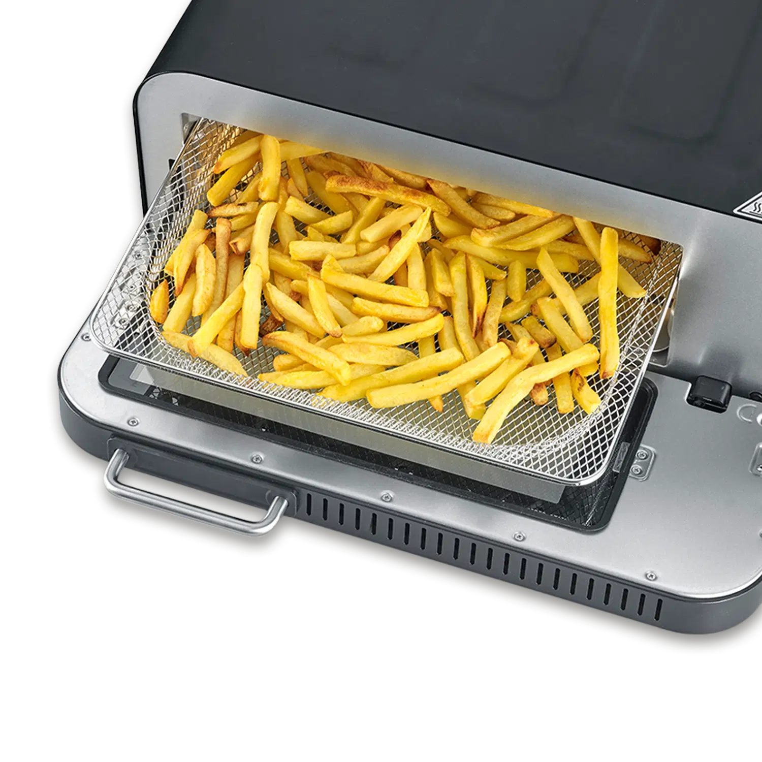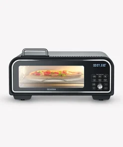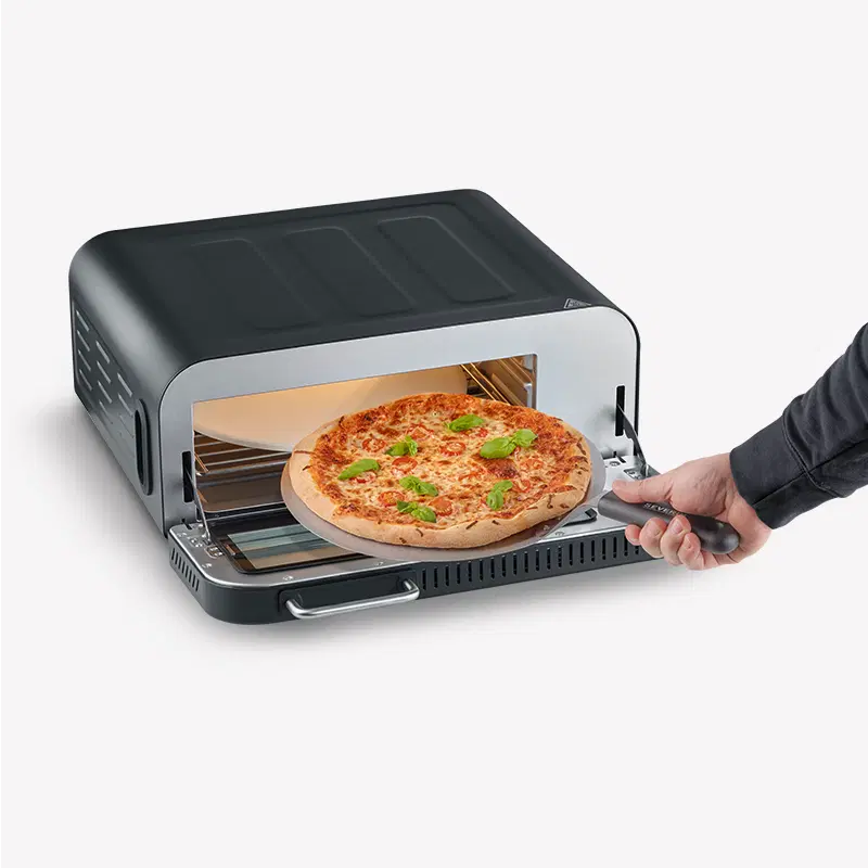 Le SERICO permet d’obtenir une pizza parfaite en moins de 5 minutes grâce à sa température de 400 °C et à son temps de chauffe court. L’écran digital intégré avec ses différents programmes est parfait pour tous les types de pizzas, qu’elles soient napolitaines, américaines ou classiques. Une pierre à pizza et une plaque de cuisson en fonte sont également fournies pour des résultats parfaits, ainsi qu’un panier à frites pour une utilisation comme une friteuse sans huile. La porte à triple vitrage permet de maintenir parfaitement la chaleur pendant la cuisson. Il possède également d’autres programmes automatiques pour le steak, les frites, le poulet et les légumes.
