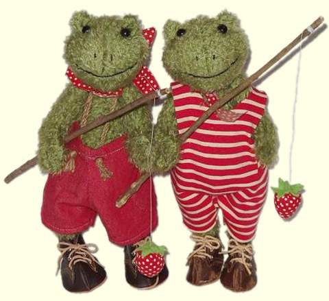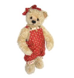 in rotweiß-gestreiftem Overall, Lederschuhen und Halstuch,