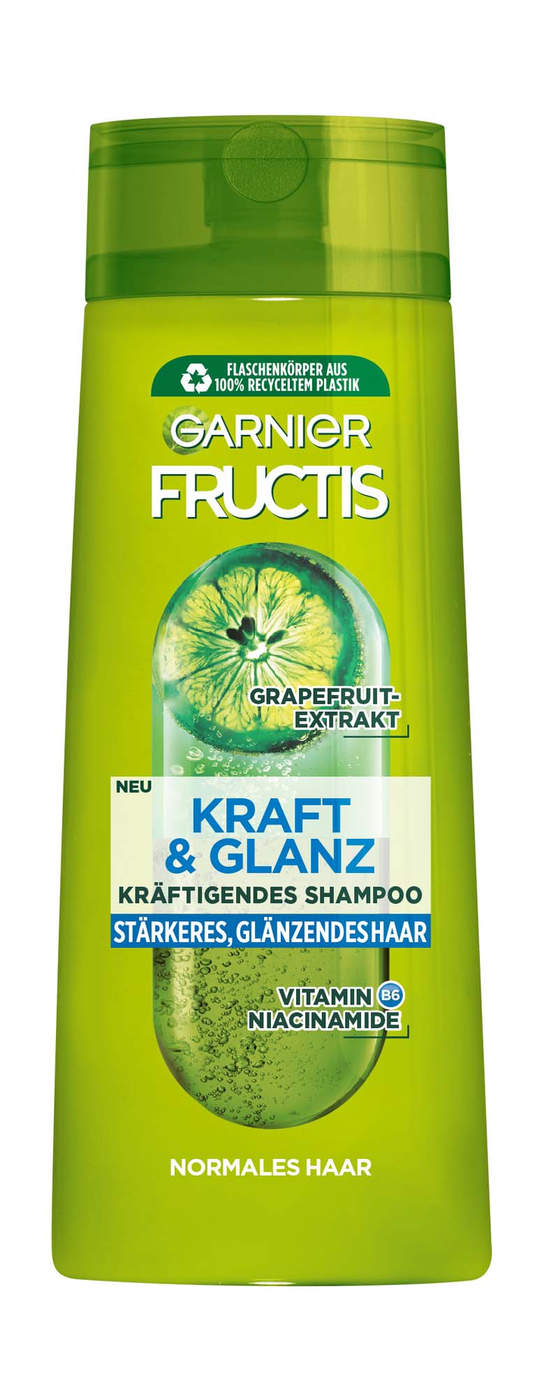 Stumpfes, glanzloses Haar? Garnier Fructis Kraft und Glanz Kräftigendes Shampoo ist die perfekte Lösung dafür. Es gibt dem Haar seine Kraft und Energie zurück und bringt es zum Glänzen. Eine besondere Kombination aus Grapefruit-Extrakt, Vitamin B6 und Niacinamiden sorgt dabei für gesund aussehendes, stärkeres Haar. Nach der Haarwäsche ist das Haar kraftvoll und frisch, mit einem wunderschönen Glanz. Die sanfte Formel eignet sich hervorragend für die tägliche Anwendung.