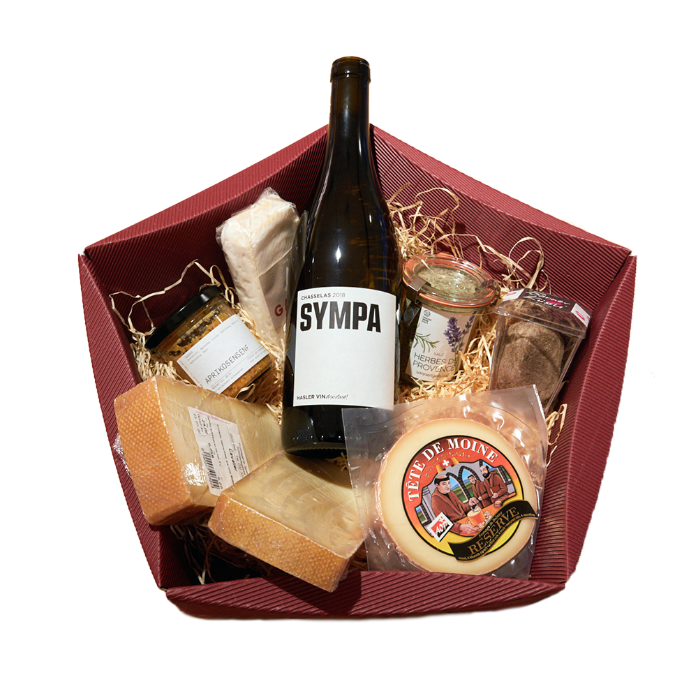 Käse mit Rotwein ist ein unschlagbares Duo. Überzeugen Sie sich selbst mit dieser Auswahl an hauseigenen Käsen, einigen kleinen Spezialitäten und einer feinen Flasche Wein aus der Region.