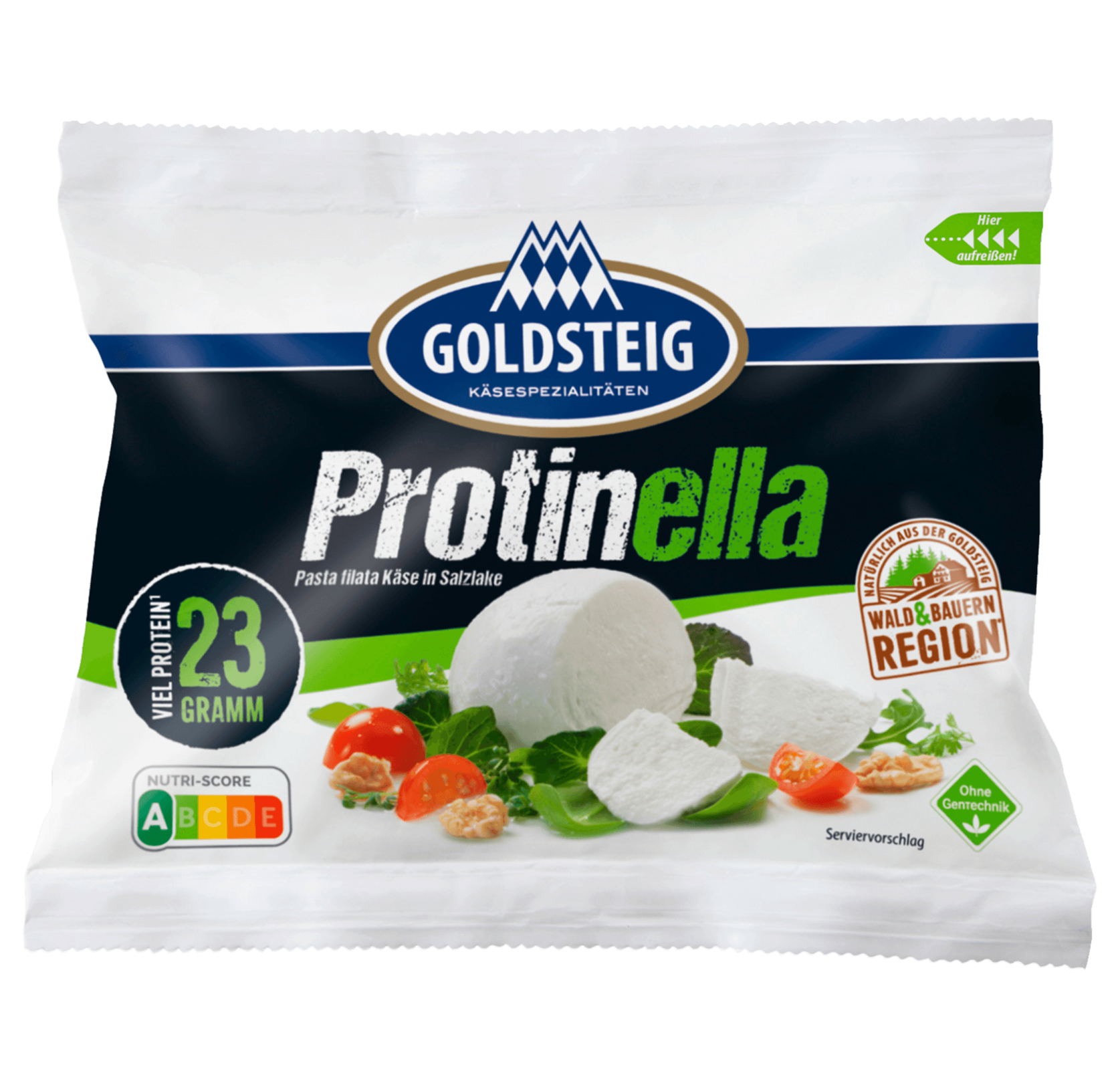 Protinella ist ein fettarmer Käsesnack und wird, wie Mozzarella, nach dem für Pasta filata Käse typischen Produktionsverfahren hergestellt. Aufgrund des hohen Gehaltes an Eiweiß und Calcium sowie den enthaltenen Nährstoffen Vitamin B2 und Zink, leistet Protinella einen wertvollen Beitrag zur Ernährung. – NUTRI-SCORE A – Natürlich aus der Goldsteig Wald & Bauern Region**Grenzenlos wie unsere Natur erstreckt sich unsere GOLDSTEIG Wald- und Bauernregion von Bayern bis nach Böhmen – Pasta Filata Käse in Salzlake – VIEL PROTEIN* – 23 GRAMM – * hoher Proteingehalt