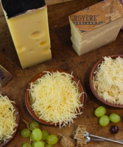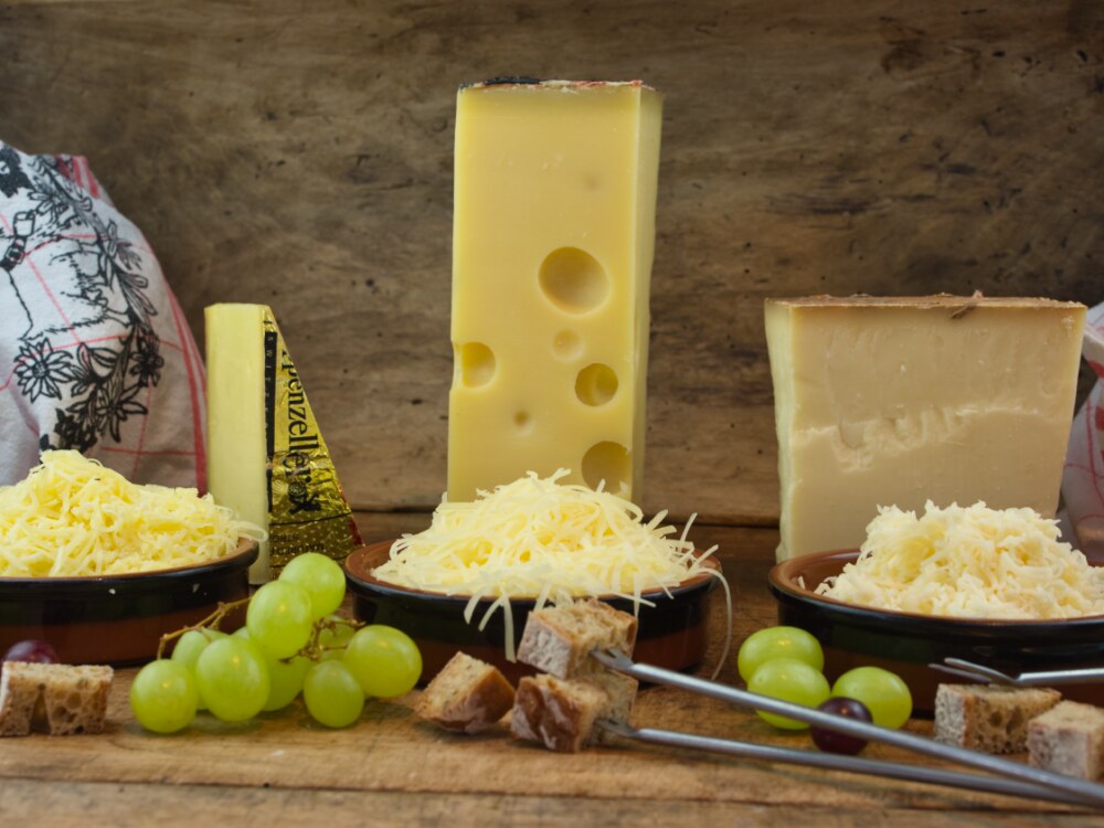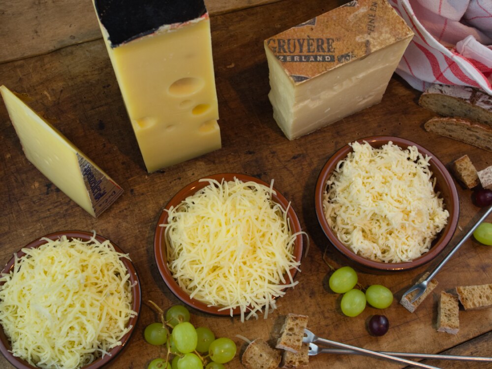 Unser würziges Käse-Fondue besteht aus 3 gleichen Anteilen: Le Gruyere, Höhlenemmentaler, Appenzeller kräftig