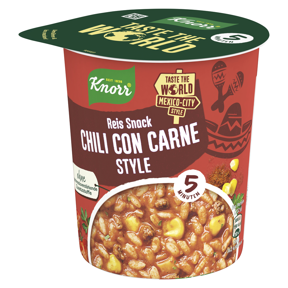 Das Knorr Sortiment Taste the World bietet Snacks in verschiedenen Geschmacksrichtungen, inspiriert von Küchen aus aller Welt. Der Knorr Reis Snack Chili con Carne Mexico-City Style im Becher ist die schnelle kleine Mahlzeit für das Büro oder wenn zu Hause mal keine Zeit zum Kochen ist.