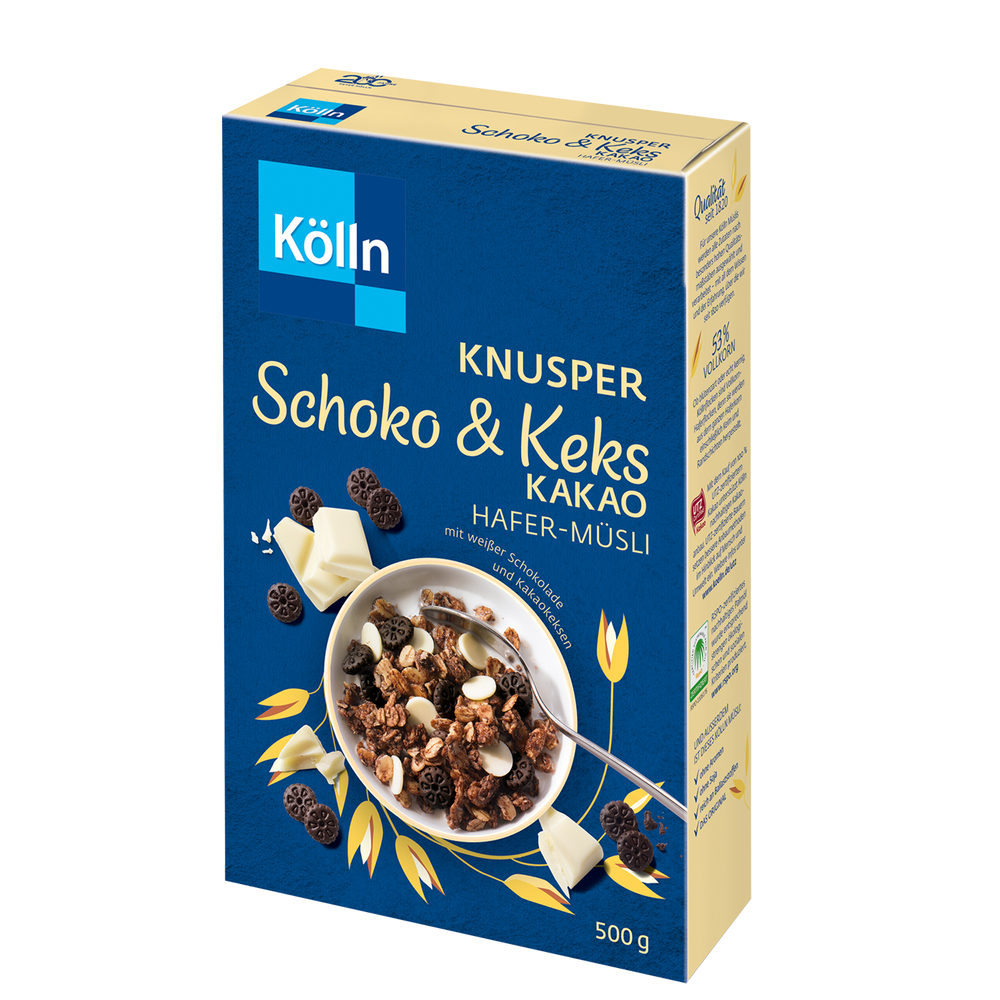 Kölln Knusper Schoko & Keks Kakao Hafer-Müsli – das Original. Innovativ in Szene gesetzt: Leckere Hafer-Knusperstückchen mit feinherber Kakao-Note kombiniert mit zartschmelzender weißer Schokolade und dunklen Mini-Kakaokeksen feiern gemeinsam Premiere in der Müslischüssel.