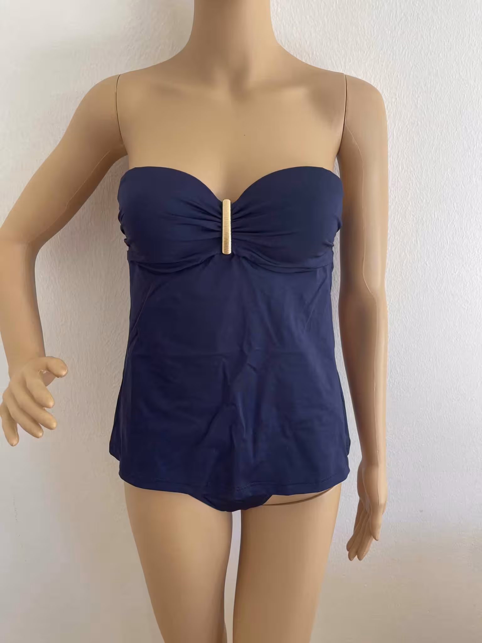 Der Tankini von Lascana hat eingearbeitete Bügel und ein Unterbrustband mit einem dekorativen Goldsteg vorn.