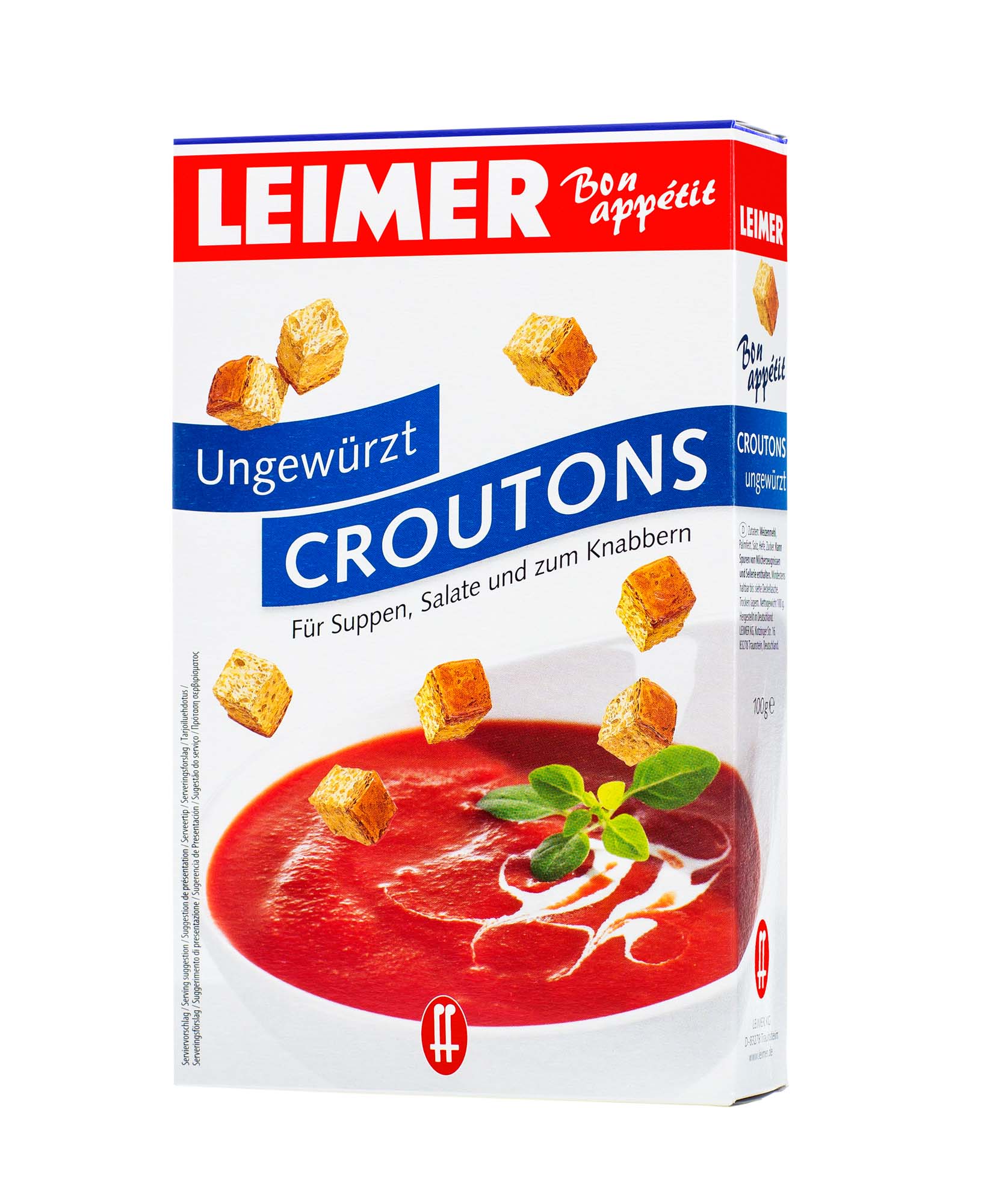 Unsere LEIMER Croutons ungewürzt werden nicht frittiert und sind deshalb eine leichte Köstlichkeit. In Würfel geschnittenes Weißbrot wird zart geröstet. Ohne künstliche Geschmacksverstärker.
