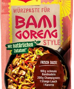 Die Rezeptur der Würzpasten kombiniert bereits alle Zutaten und Gewürze, die für ein Nudelgericht Bami Goreng Style benötigt werden. So kann man die Würzpaste während der Zubereitung direkt mit den frischen Zutaten wie Champignons, Lauch und Karotte zu einem leckeren, internationalen Gericht kombinieren. Dank der pastösen Textur vermengt sich die Würzpaste ideal mit den frischen Zutaten.