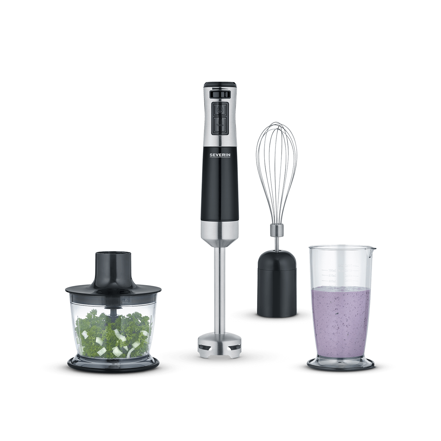 - Multi-hachoir (capacité de 0,5l) : Idéal pour hacher des herbes, des oignons, de la viande, du fromage, des amandes / noix et bien plus encore.