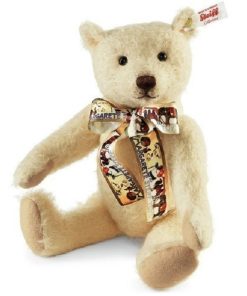 Am linken Bein ist eine vergoldete Metallplombe mit der geprägten Limitierungsnummer des Bären fest eingenietet.