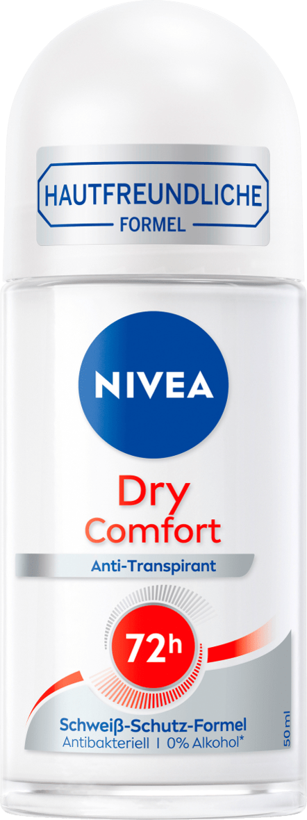 Für trockenere Achseln! Der NIVEA Dry Comfort Deo Roll-On bietet 72 Stunden lang zuverlässigen Anti-Transpirant-Schutz vor Schweiß und unangenehmem Körpergeruch. So kannst du unbesorgt in den Tag starten! Die hocheffektive Dual-Active-Formel mit zwei besonders wirksamen Anti-Transpirant-Inhaltsstoffen wirkt effektiv gegen Achselnässe, hält die Achseln angenehm trocken und verhindert so unangenehmen Körpergeruch – für langanhaltend trockenere Achseln. Der Deodorant Roll-On bietet einen femininen, milden Duft und pflegt die zarte Haut unter den Achseln. Die Hautverträglichkeit ist dermatologisch bestätigt. NIVEA Deodorants bieten dir eine Kombination aus sicherem Schutz und sanfter Pflege. Für ein angenehm, trockenes Hautgefühl: NIVEA Dry Comfort Deo Roll-On. Finde jetzt dein neues Lieblingsdeo von NIVEA!