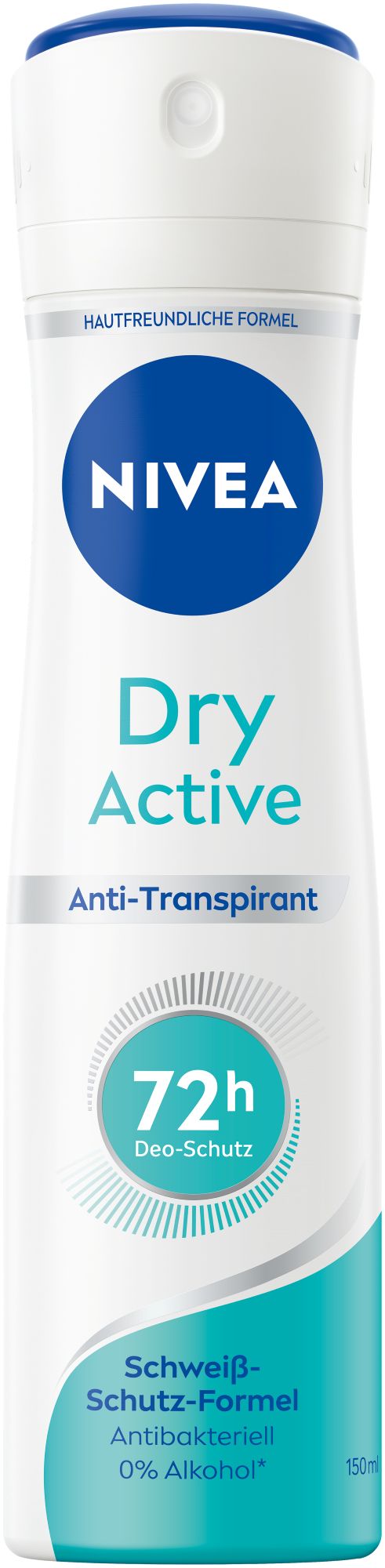 NIVEA Dry Active Spray bietet zuverlässigen Anti-Transpirant-Schutz – 72 Stunden lang. Die hocheffektive Dual-Active-Formel mit zwei besonders wirksamen Anti-Transpirant-Inhaltsstoffen wirkt effektiv gegen Achselnässe, hält die Achseln angenehm trocken und verhindert so unangenehmen Körpergeruch. Das Spray bietet einen femininen, frischen Duft, pflegt die Haut sanft und ist in einer 100% recycelten Alu-Dose verfügbar: NIVEA Dry Active Spray.