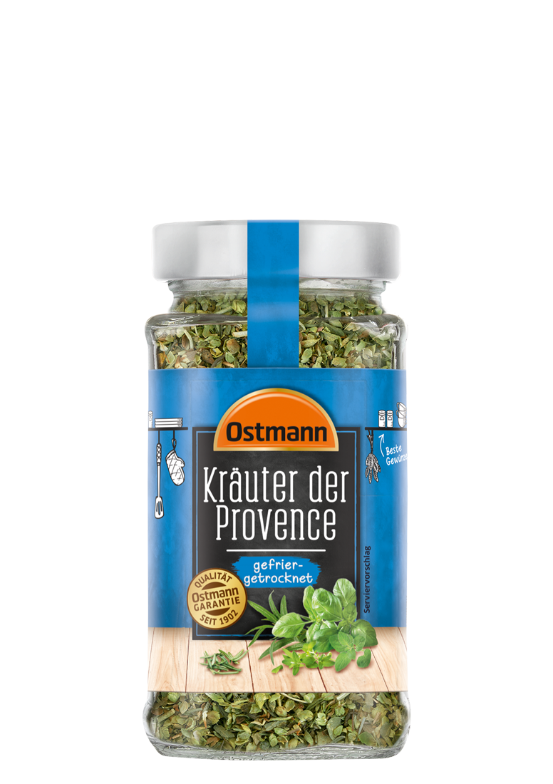 Ostmann Kräuter der Provence sind aromaschonend gefriergetrocknet. Passen zu Lamm, Steaks, Medaillons, Ratatouille, Gemüse, Saucen, Suppen, Eintöpfen und Kartoffelgerichten. Ideal zu Geflügel und Fischgerichten.