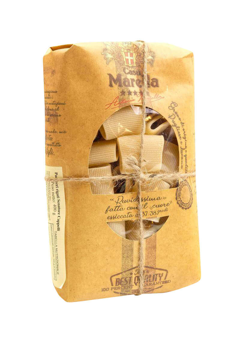 1978 gründete Antonio Marella mit viel Hingabe dieses exquisite Pastificio in Apulien. Tradition, Handarbeit und beste Qualität begründen den weltweiten Ruf von Marella. Das Mehl für die Nudeln kommt ausschließlich aus Altamura (Apulien) und stammt aus biologischem Anbau. Die Pasta wird durch Bronze-Aufsätze gepresst, so entsteht die raue und poröse Oberfläche, durch die sich Nudel und Sauce perfekt “aneinanderschmiegen”. Bei sehr niedrigen Temperaturen (37-38 ° C) trocknet die Pasta langsam und schonend.