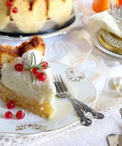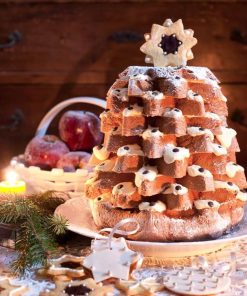 Der hochaufragende, gezackte Kuchen wird traditionell mit Staubzucker gepudert. Man kann ihn auch horizontal schneiden, dann präsentieren sich auf dem Teller verlockende Scheiben in Sternform
