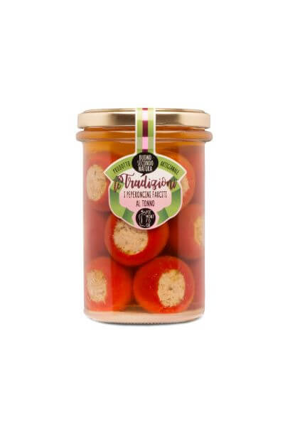 Diese Peperoncini werde von Hand mit Thunfisch und Kapern gefüllt, eine perfekte Ergänzung für eine italienische Jause.