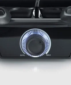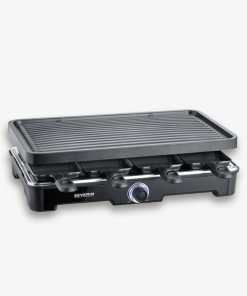 Raclette Grill mit 8 antihaft-beschichteten Pfännchen. Dazu eine hochwertige Grillfläche mit Keramikbeschichtung perfekt für Fleisch, Fisch oder Gemüse. Variable Temperatureinstellung mit LED-Beleuchtung und 8 Kunststoff-Spatel mit im Lieferumfang.