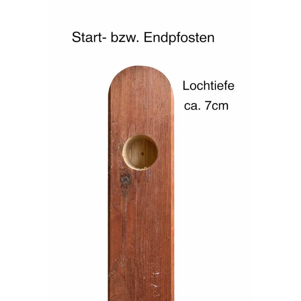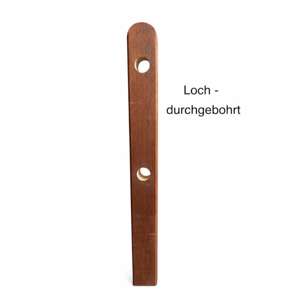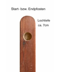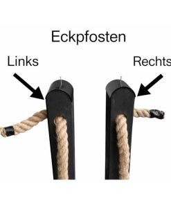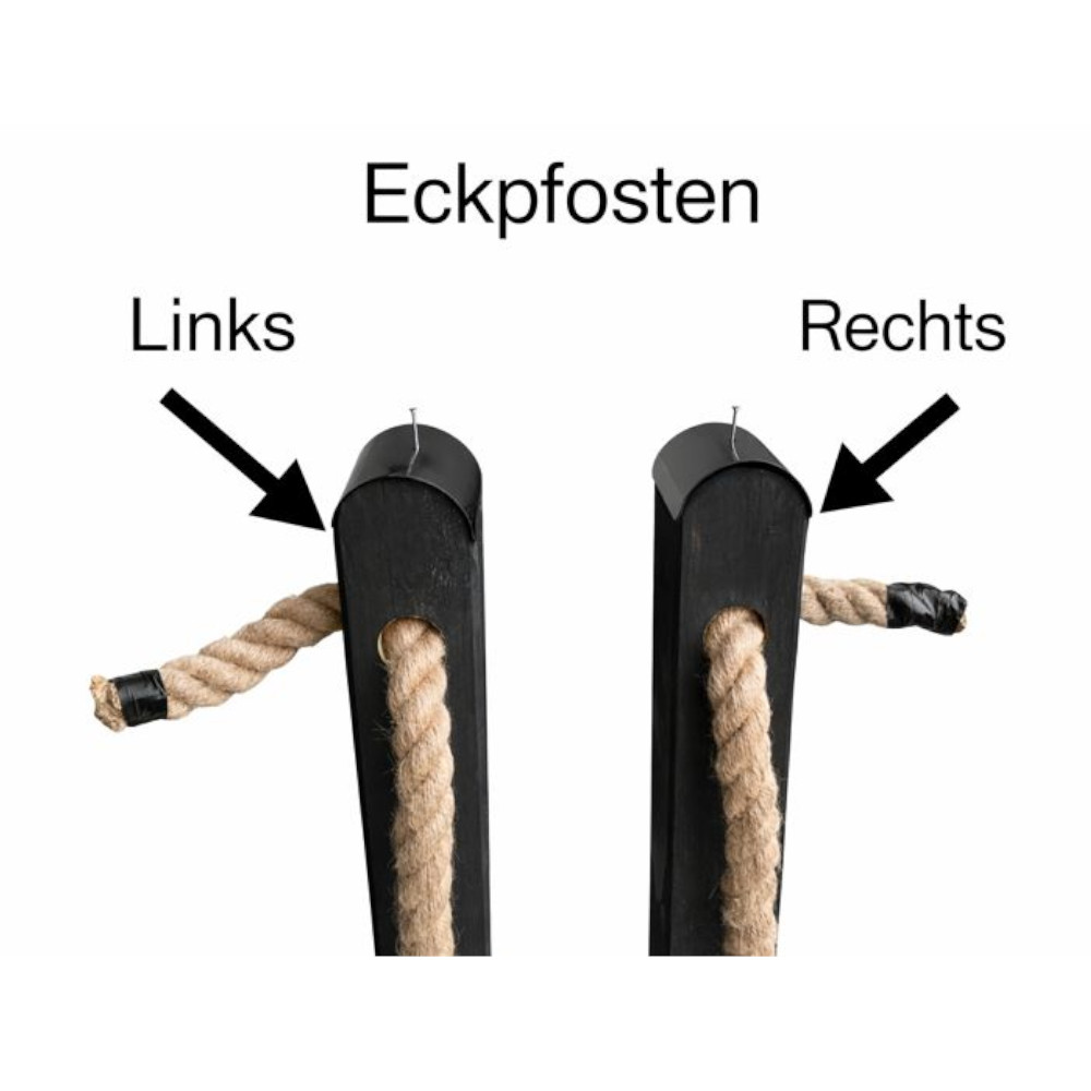Da es sich um Naturholz handelt, können Astlöcher, Farbabweichungen oder Dehnungsrisse auftreten – insbesondere durch die 45-mm-Bohrung. Diese Eigenschaften sind holztypisch und stellen keinen Mangel dar. Naturjuteseile können sich bei Nässe leicht zusammenziehen, daher sollten die Schlaufen etwas großzügiger gestaltet und das Seil in jedem Pfosten mit einer Schraube fixiert werden.