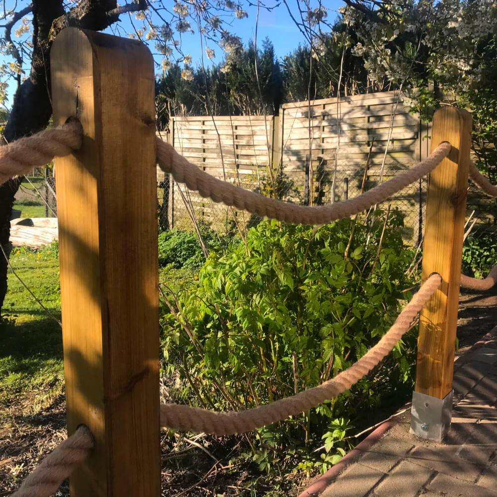 Der Pfosten ist speziell für Seilzäune konzipiert und verfügt über eine Bohrung mit 45 mm Durchmesser, die optimal auf gängige Seilstärken abgestimmt ist. Wir empfehlen die Verwendung von Juteseilen mit 36 mm oder 40 mm Durchmesser. Bei Eckpfosten lässt sich das 36-mm-Seil besonders leicht durchführen.