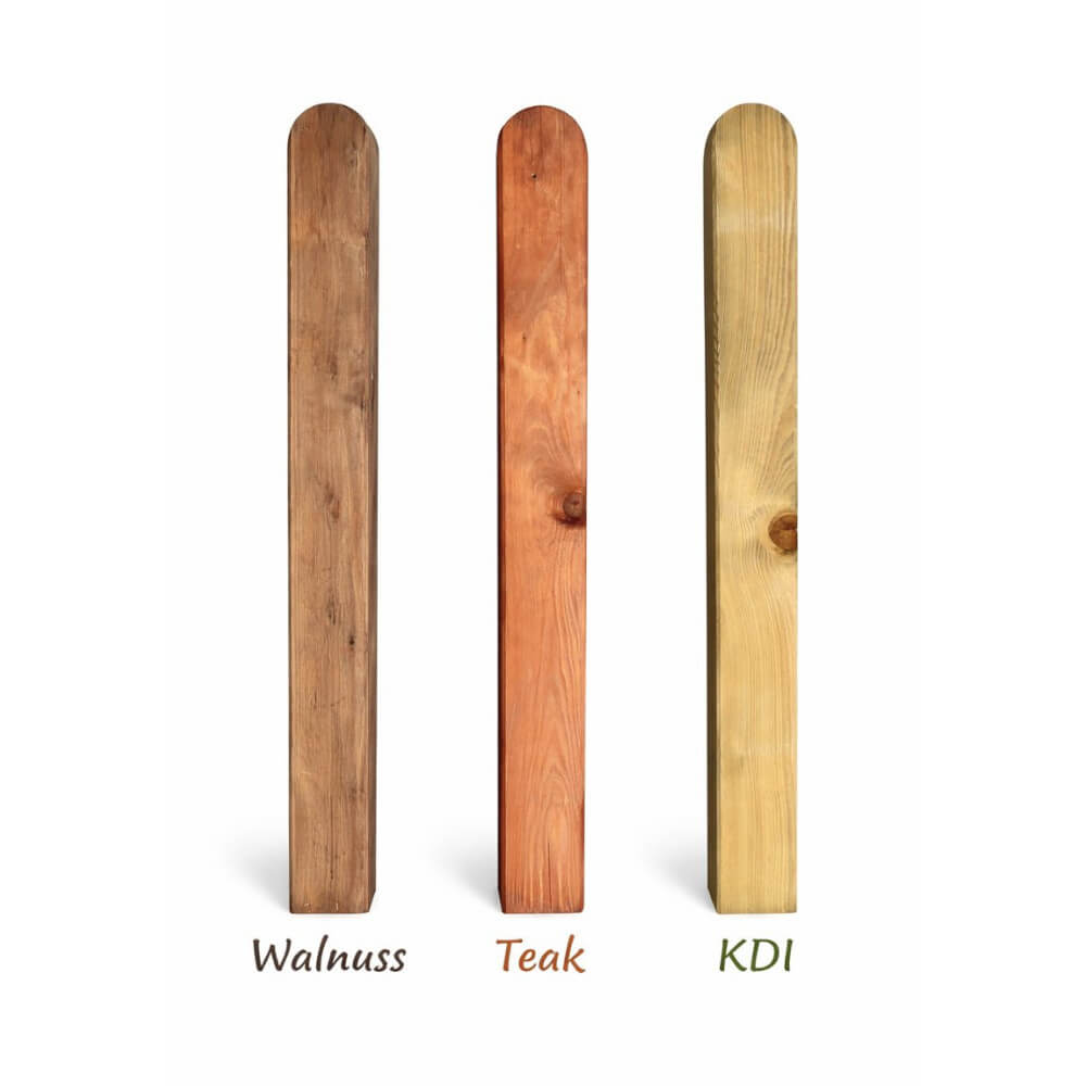 Dank der Kesseldruckimprägnierung ist das Kiefernholz bestens gegen Witterungseinflüsse geschützt und für den dauerhaften Einsatz im Außenbereich geeignet. Erhältlich in den Farbvarianten Natur KDI (Kesseldruckimprigniert), Teak und Walnuss, fügt sich der Pfosten harmonisch in Gärten, Wege, Terrassen oder maritime Gestaltungen ein.