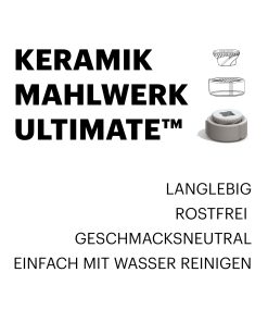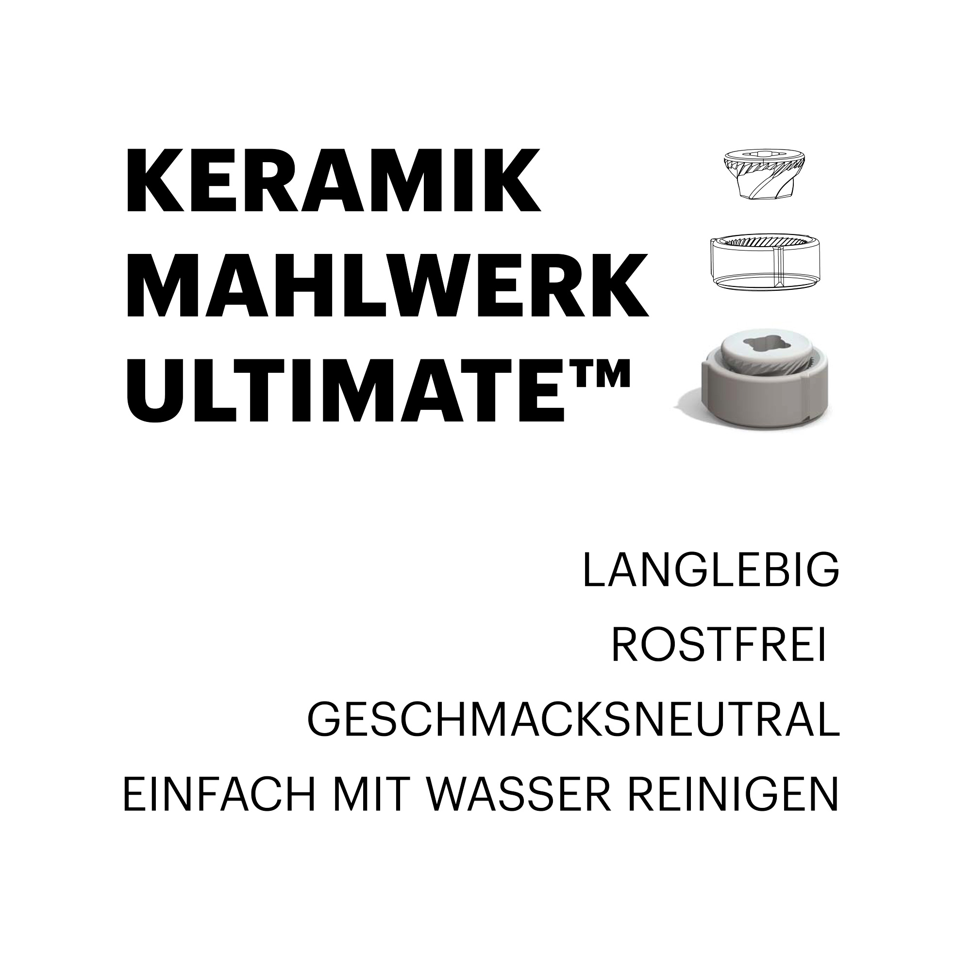 Das Herzstück der Gewürzmühle ist das High-Tech Keramikmahlwerk von CrushGrind®. Der Mahlgrad ist fix auf eine angenehme Granulierung eingestellt. Die verwendete Keramik ist härter als Stahl, rostet nicht und ist geschmacksneutral. Neben Pfeffer, Salz und Chili können damit auch viele andere Gewürze und Kräuter gemahlen werden.
