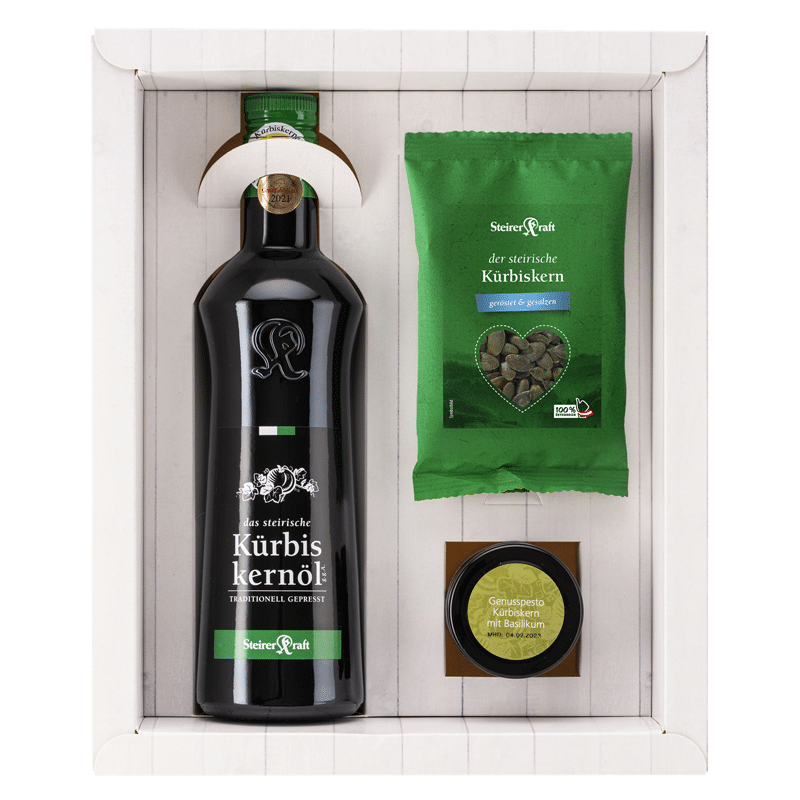 Gift set Styrian enjoyment composed of: Styrian pumpkin seeds roasted/salted Premium (Steirerkraft), 40 g, Styrian pesto pumpkin seed with basil (Steirerkraft), 80 g, Styrian pumpkin seed oil PGI Premium (Steirerkraft), 500 ml.