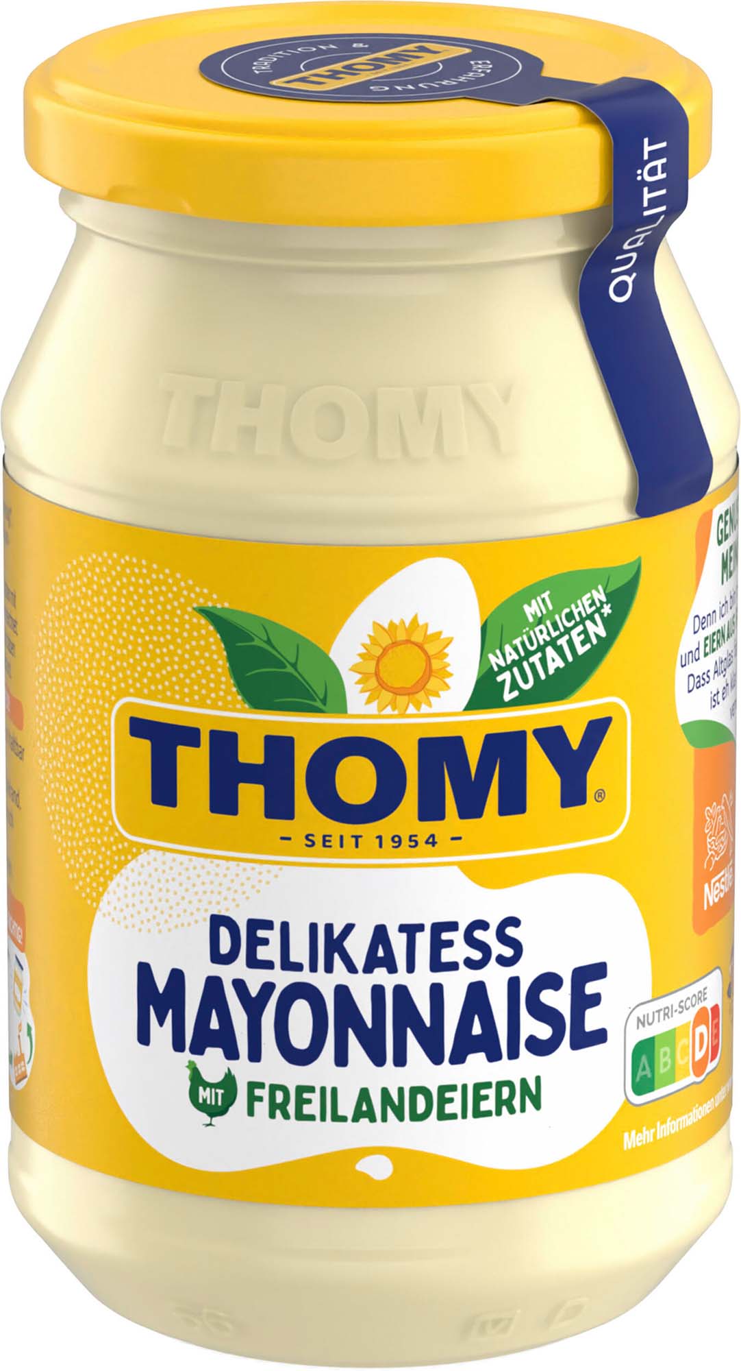 Genuss liegt in meiner Natur Für den vollen Geschmack: Deckel ab. Denn ich bin mit natürlichen Zutaten* und Eiern aus Freilandhaltung gemacht. Dass Altglas fast zu 100 % recycelbar ist, ist eh klar. Und einen Teil davon verwenden wir selbst auch wieder. Schmeckt und fühlt sich gut an. Mit Eiern aus Freilandhaltung Mit natürlichen Zutaten Ohne Konservierungsstoffe, Farb- oder Aromastoffe Mit reinem Sonnenblumenöl und besonders cremig-lecker Nutri-Score D Recycelbare Verpackung: Altglas ist fast zu 100 % recycelbar Ideal für Kartoffel- und Nudelsalate, Sandwiches, Pommes und noch vieles mehr THOMY hier kommt der Genuss In höchster Thomy-Qualität Der Nutri-Score ist ein freiwilliges Kennzeichnungssystem, das als Orientierungshilfe dient, Lebensmittel nach ihrer Nährwertqualität zu bewerten. Verbraucher können mithilfe der fünfstufigen und farbig hinterlegten Buchstabenskala das Nährwertprofil eines Produkts erkennen.