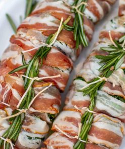 Hähnchenfilet mit Bergkäse gefüllt, gewürzt mit rotem Pesto und mit südtiroler Schinkenspeck gewickelt. Bei 180° für 25 Minuten im Backofen garen