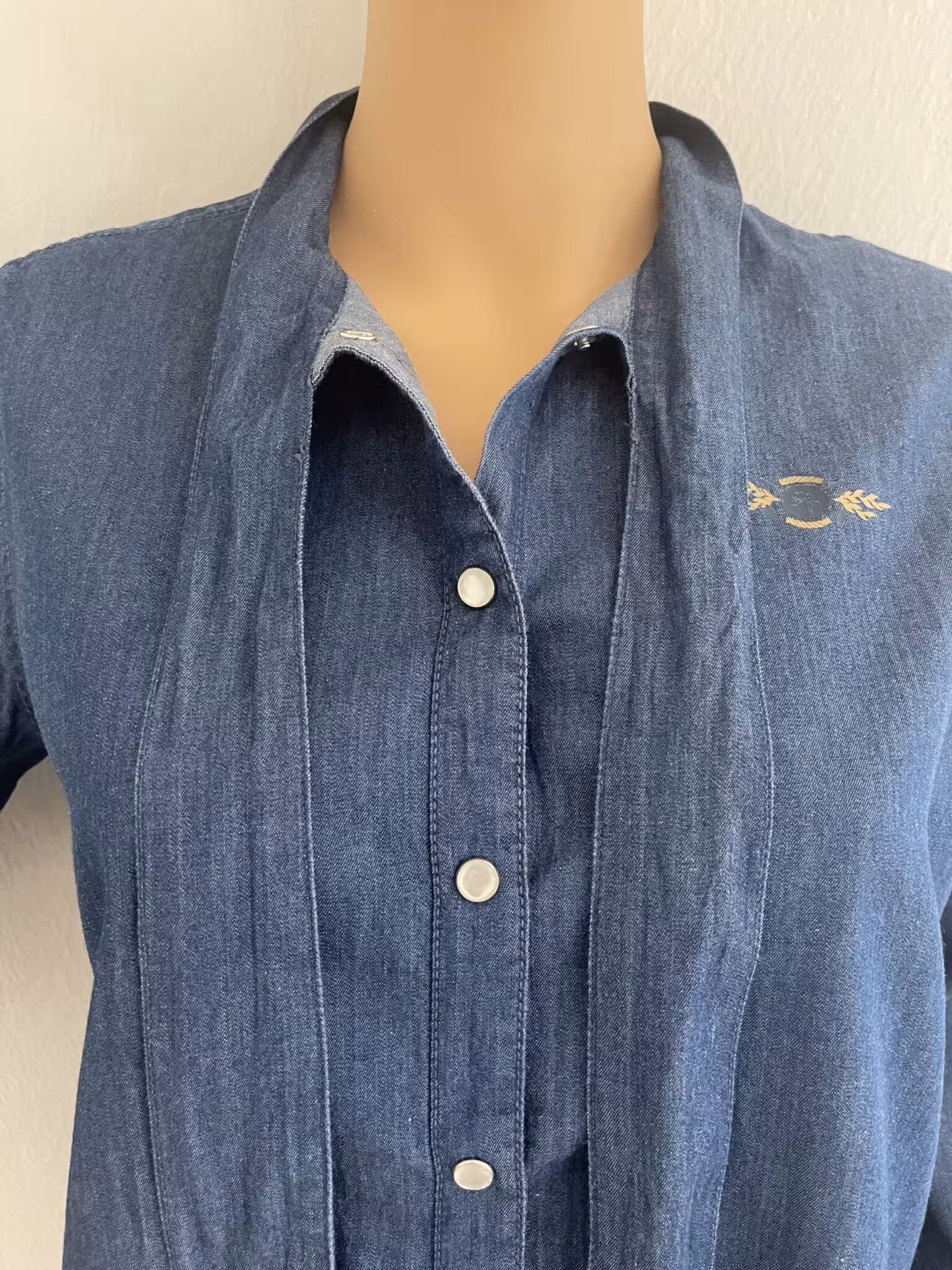 Sie ist durchgehend geknöpft, hat einen leichten Stehkragen mit Bindeband, ist seitlich leicht abgerundet und besticht mit mit dem typischen Markenlogo.