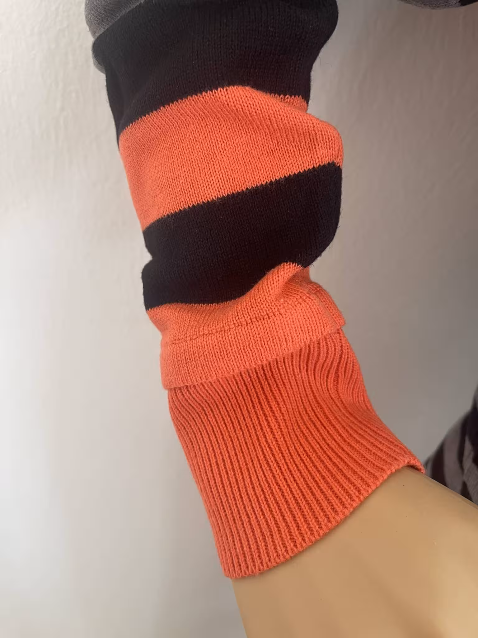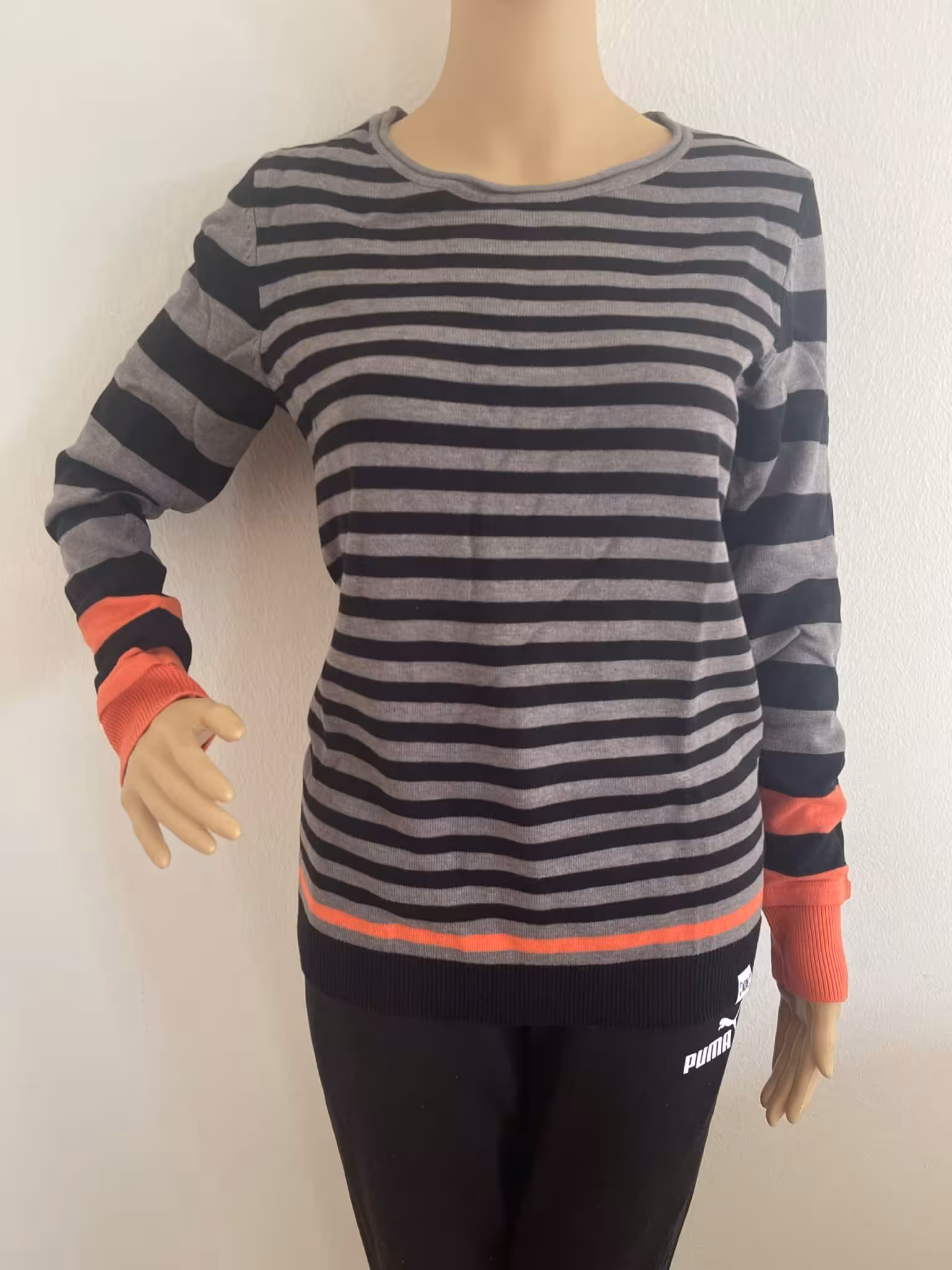 Der Rundhalsausschnitt ist schmal eingefasst und unterstreicht die hochwertige Ausstrahlung dieses Streifenpullis mit auffallender Kontrastfarbe.