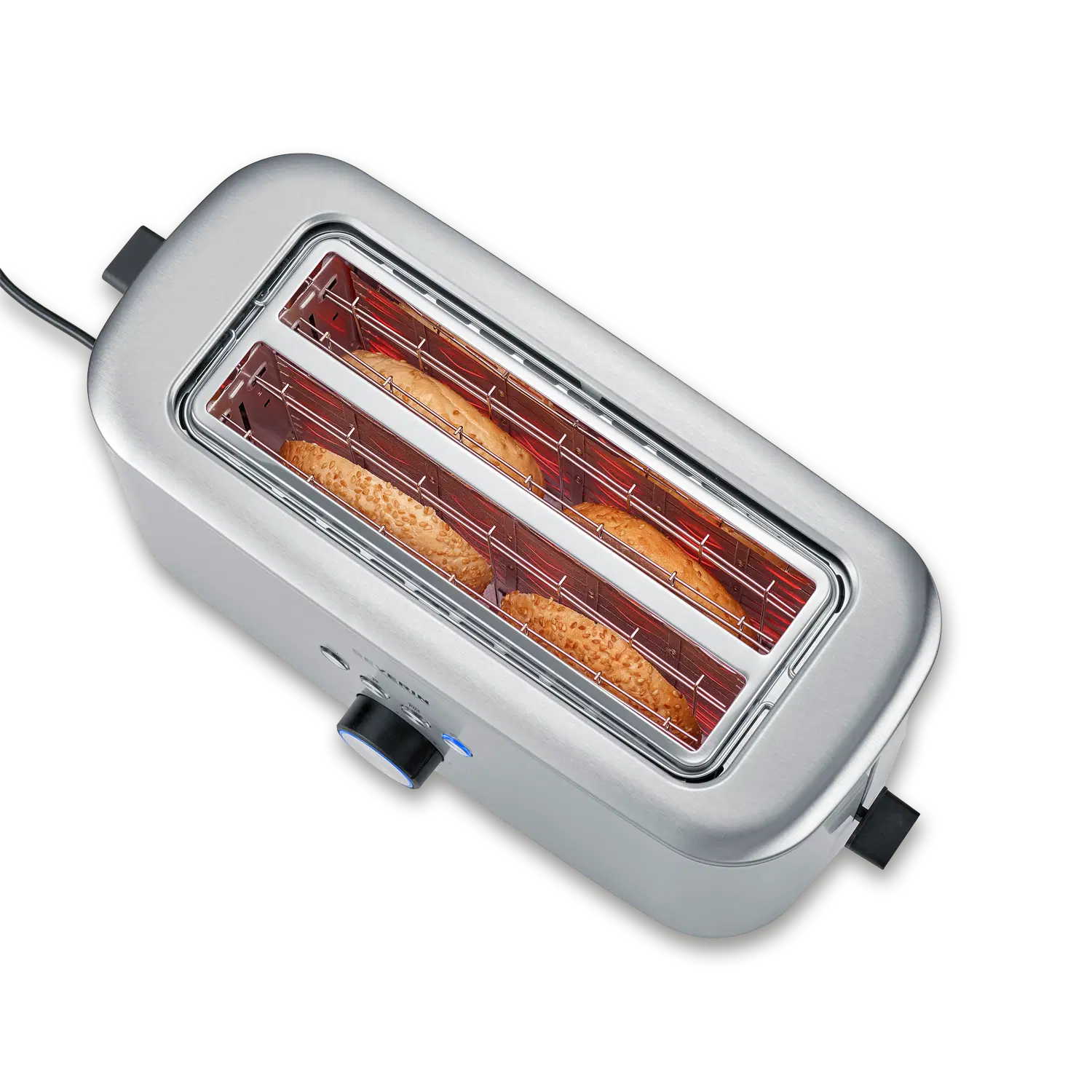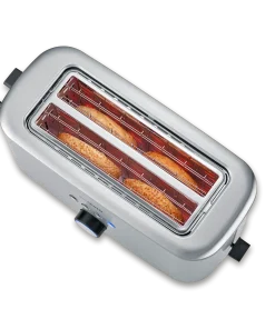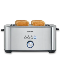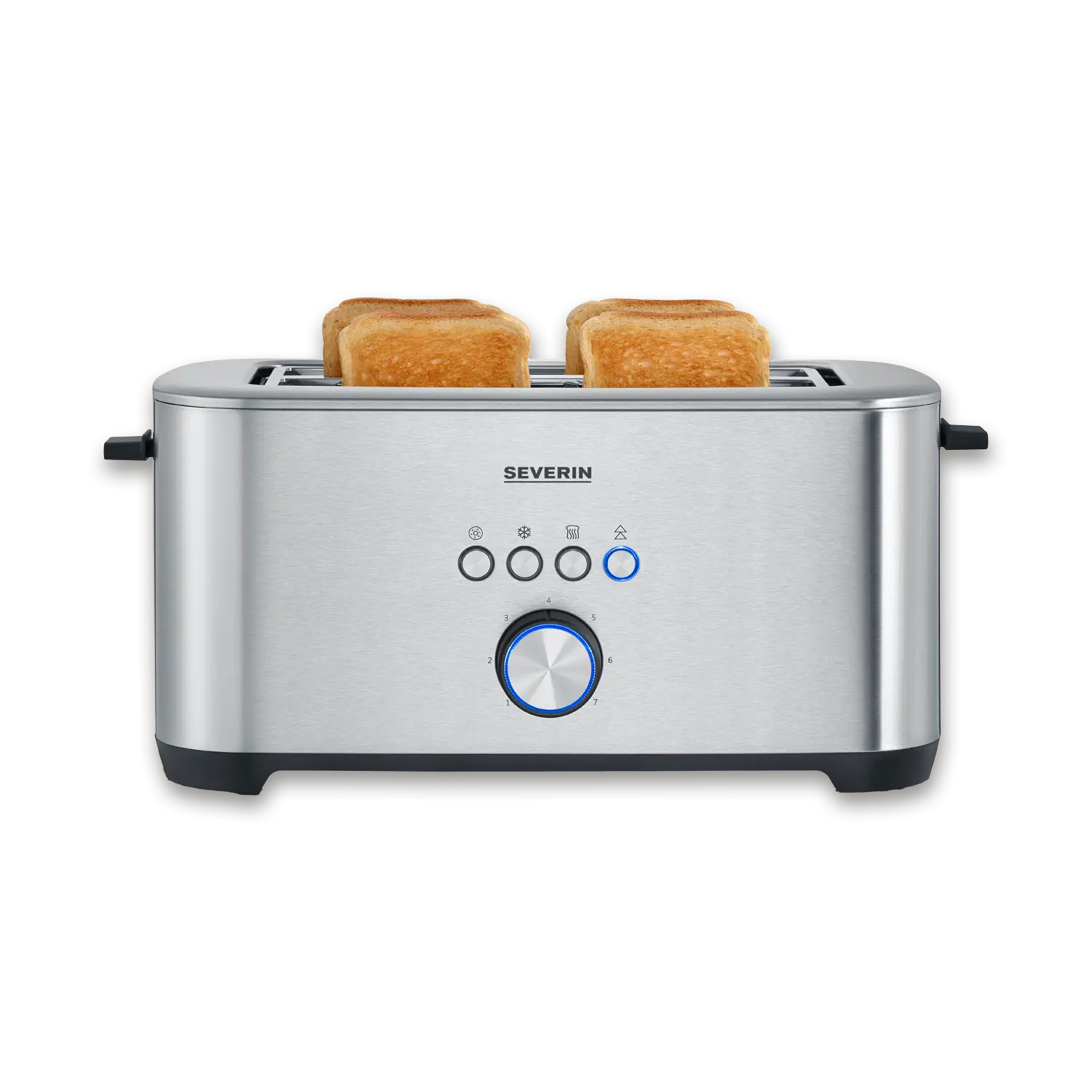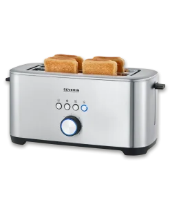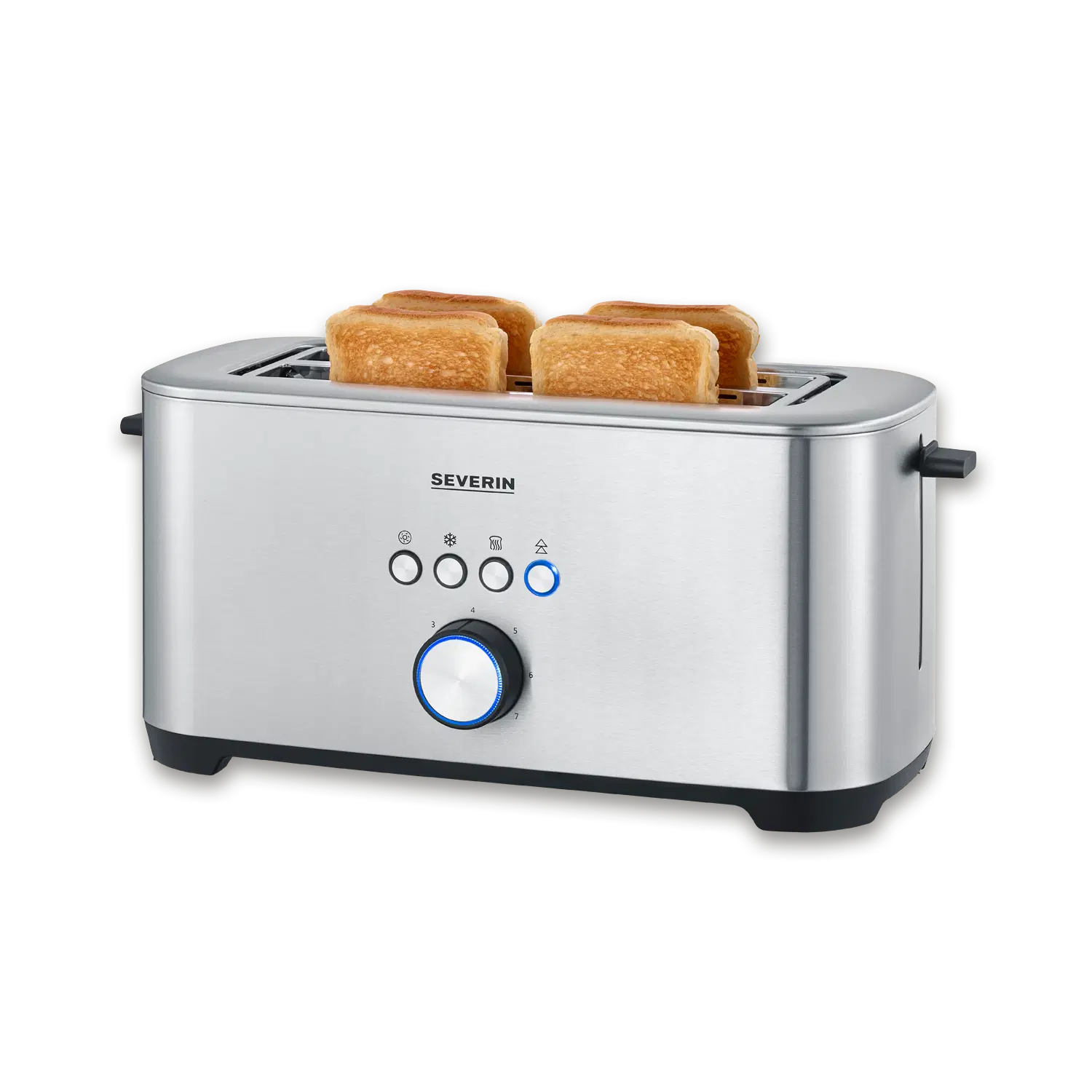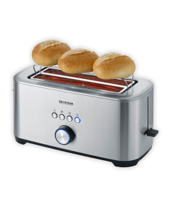 PERFECTA PARA 4 TOSTADAS XXL – CON PRÁCTICA FUNCIÓN BAGEL. Bien doradas, perfectamente escalonadas y ajustables individualmente: la AT 2621 de SEVERIN convierte el pan sencillo en tostadas perfectas – o bagels. Por un lado caliente, por el otro crujiente – la función integrada para bagels produce los resultados más deliciosos al “estilo americano”, ahorrando al mismo tiempo energía. La estrella del diseño de SEVERIN no sólo llama la atención en la cocina, sino que también garantiza resultados perfectos. Gracias a las cámaras de tostado XXL, se puede tostar incluso pan grande a pesar del diseño que ahorra espacio, mientras que la función de centrado de rebanadas de pan garantiza unos resultados de dorado perfectos. Los botones de descongelación, recalentamiento y liberación y los 7 niveles de tostado ajustables garantizan resultados personalizados. Una bandeja recogemigas “push-to-open” completa el diseño y facilita la limpieza. El tostador también está equipado con un accesorio para panecillos integrado que facilita la preparación de panecillos.
