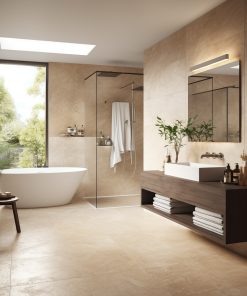 Travertino Navona besticht durch seine helle und warme Farbgebung. Travertino Navona verleiht jeder Einrichtung mit seiner klaren gestreiften Struktur und den gespachtelten Poren eine elegante und helle Komponente. Abgebaut wird dieser Travertin bei Tivoli östlich von Rom.